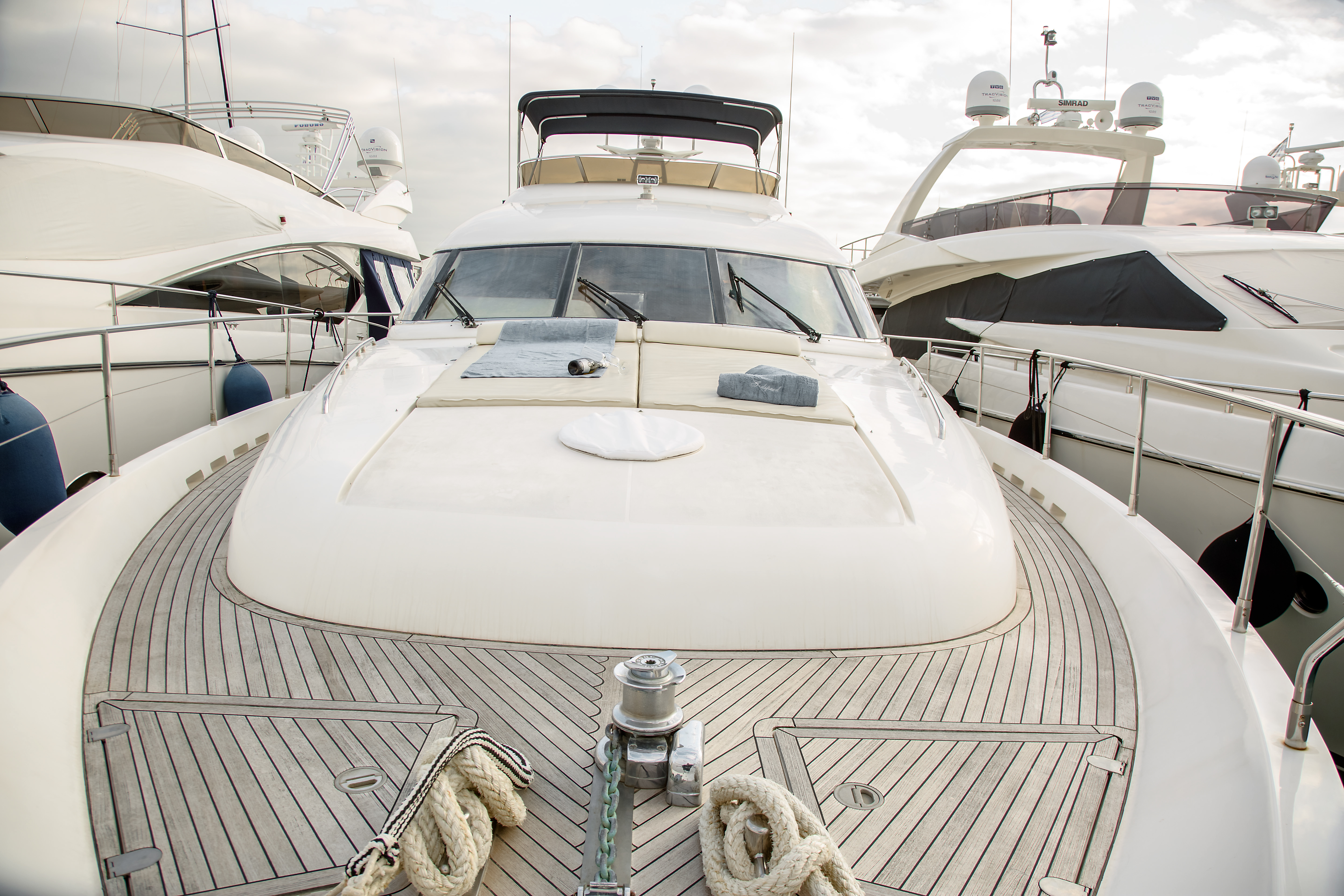 There is a beautifully sculpted sofa, that curves around from bow to port to aft, accommodating all guests with ease. There is a convenient table for resting snacks and refreshments, and the hardtop above provides shade and ...
