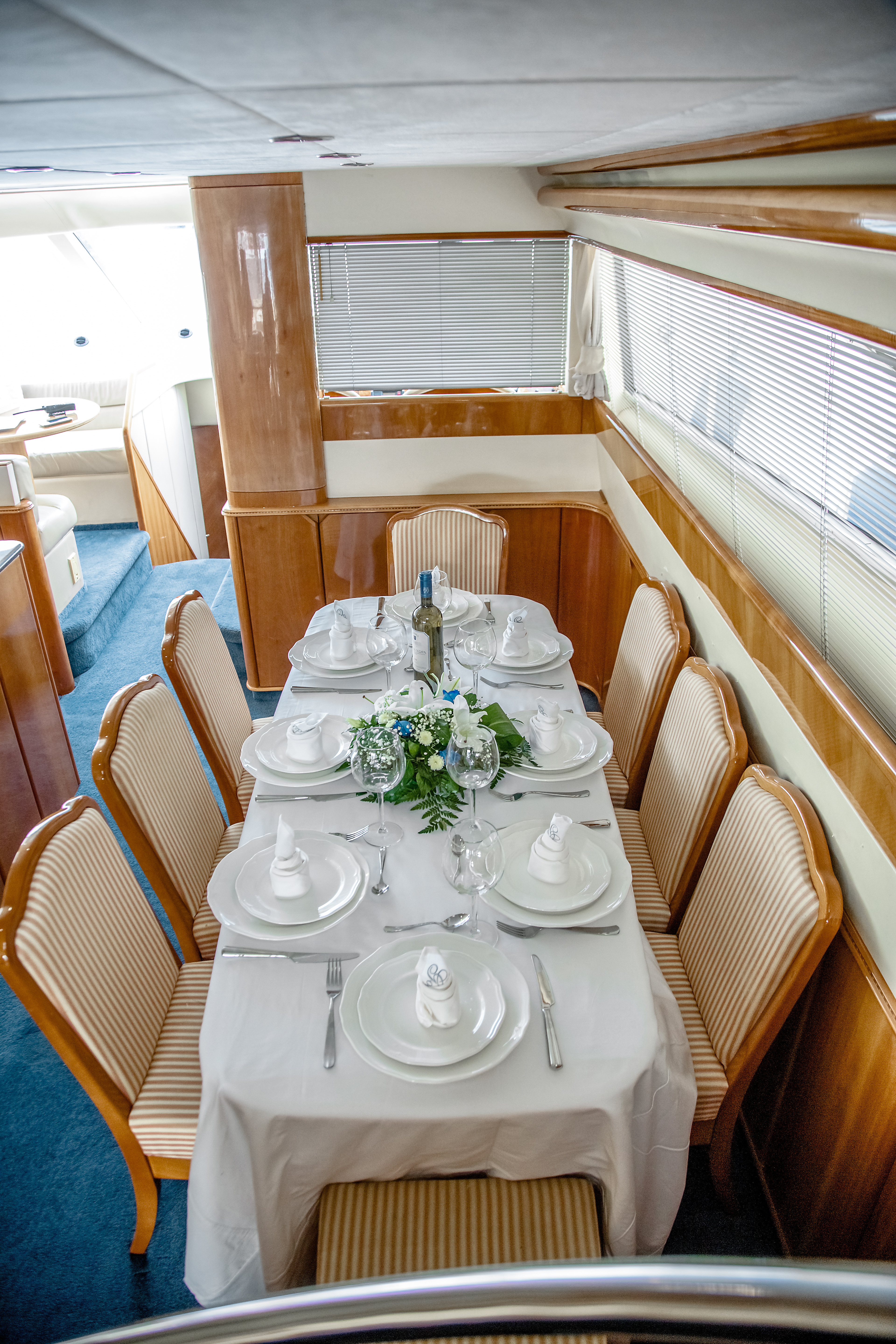 The main deck aft features a lovely outdoor dining area. Sofa seating lines the stern, with additional chairs surrounding an oval dining table, making for the perfect place to enjoy casual al fresco meals in the sun.