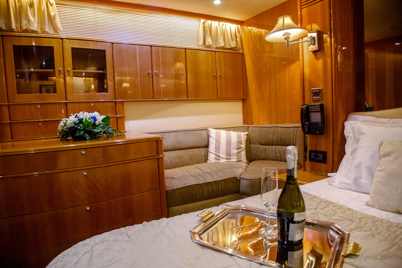 She features a variety of sunbathing spots, with a wonderful flybridge seating area providing guests with incredible 360 views of the surroundings. Her 2 x 1300 HP MAN engines allow for a fast maximum speed of 25 knots, and a cruising speed of 21 knots.