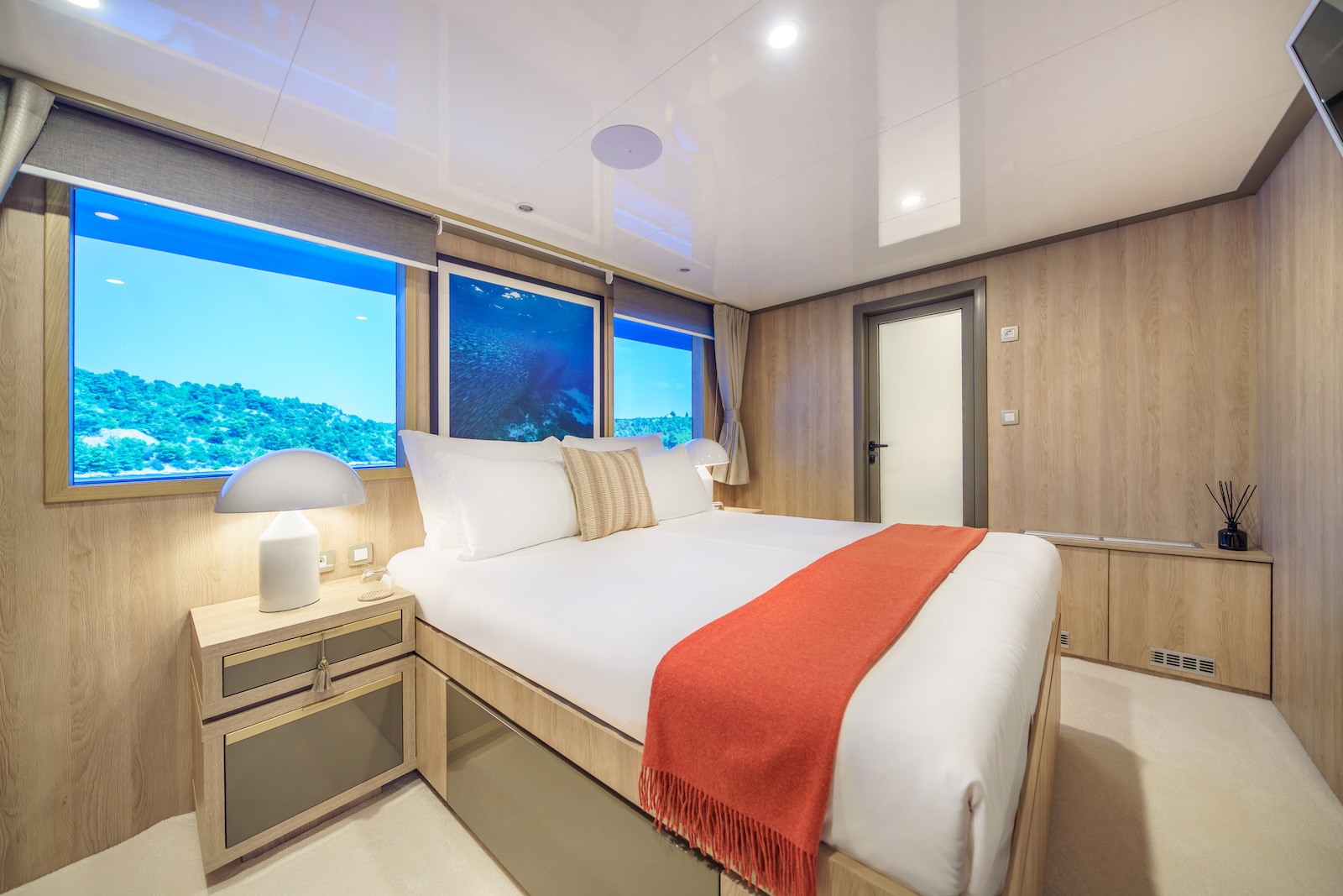 Her accommodation spreads over 11 spacious cabins, sleeping up to 22 guests. She has further cabins for a professional and friendly crew of 13.