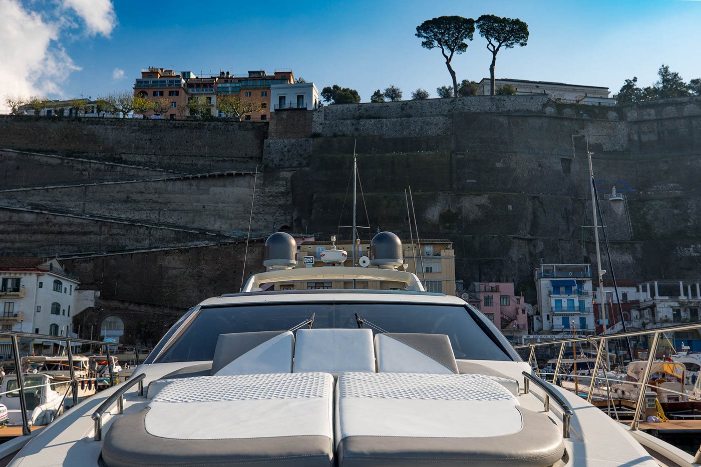 On the opposite is a convenient kitchenette complete with sink, grill and ice maker. Aft of this is an excellent sunbathing area, with broad sunpads allowing guests to relax and soak up the sun and sight. Forward is another sunbathing area, with sunpads providing the perfect spot to take in the views while cruising.