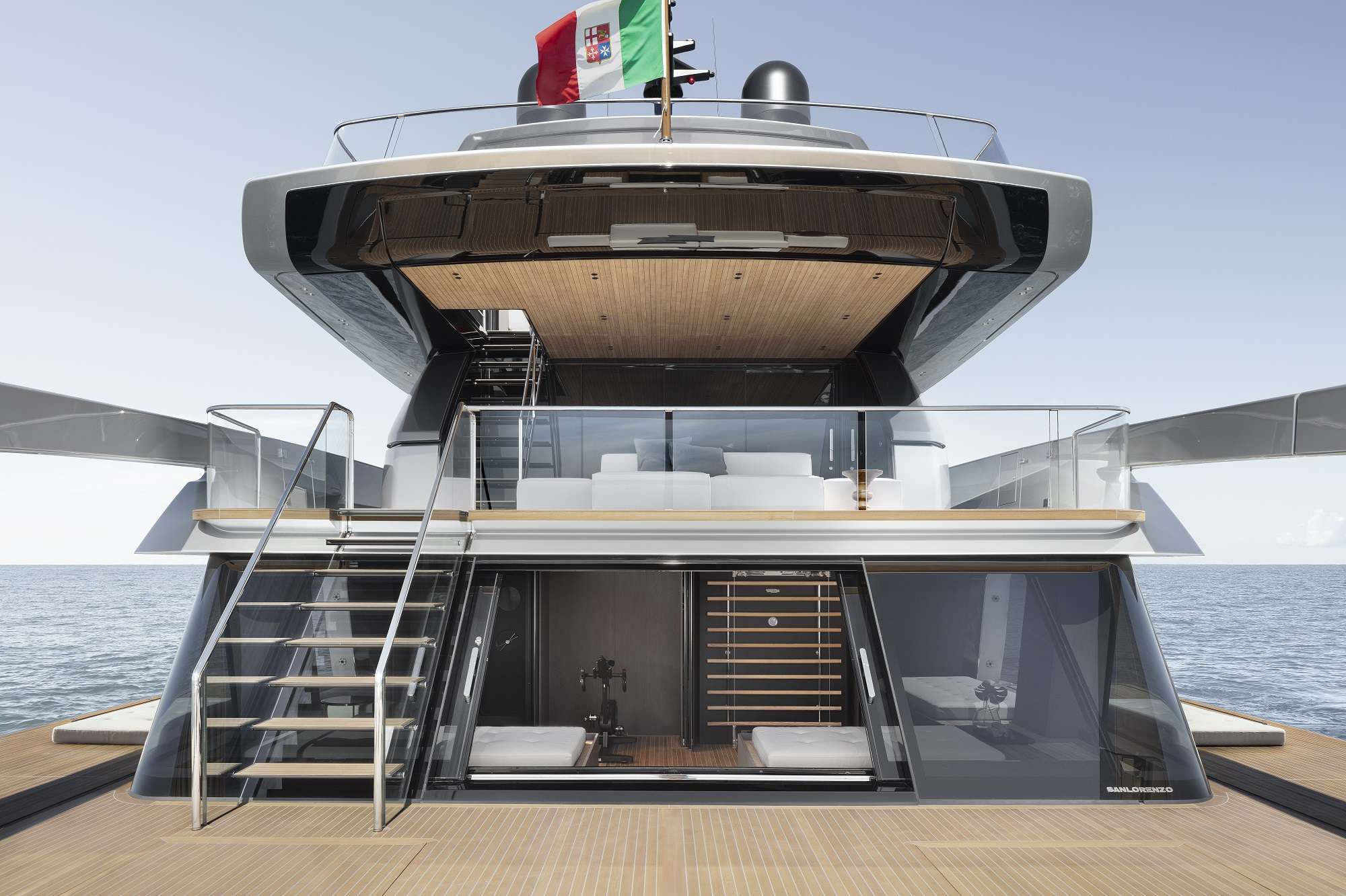 The spacious beach club has plenty of sofa/sunbeds and gym equipment, plus fold-down terraces on both sides to extend the space and a glass sliding door aft onto the lower deck swim platform.