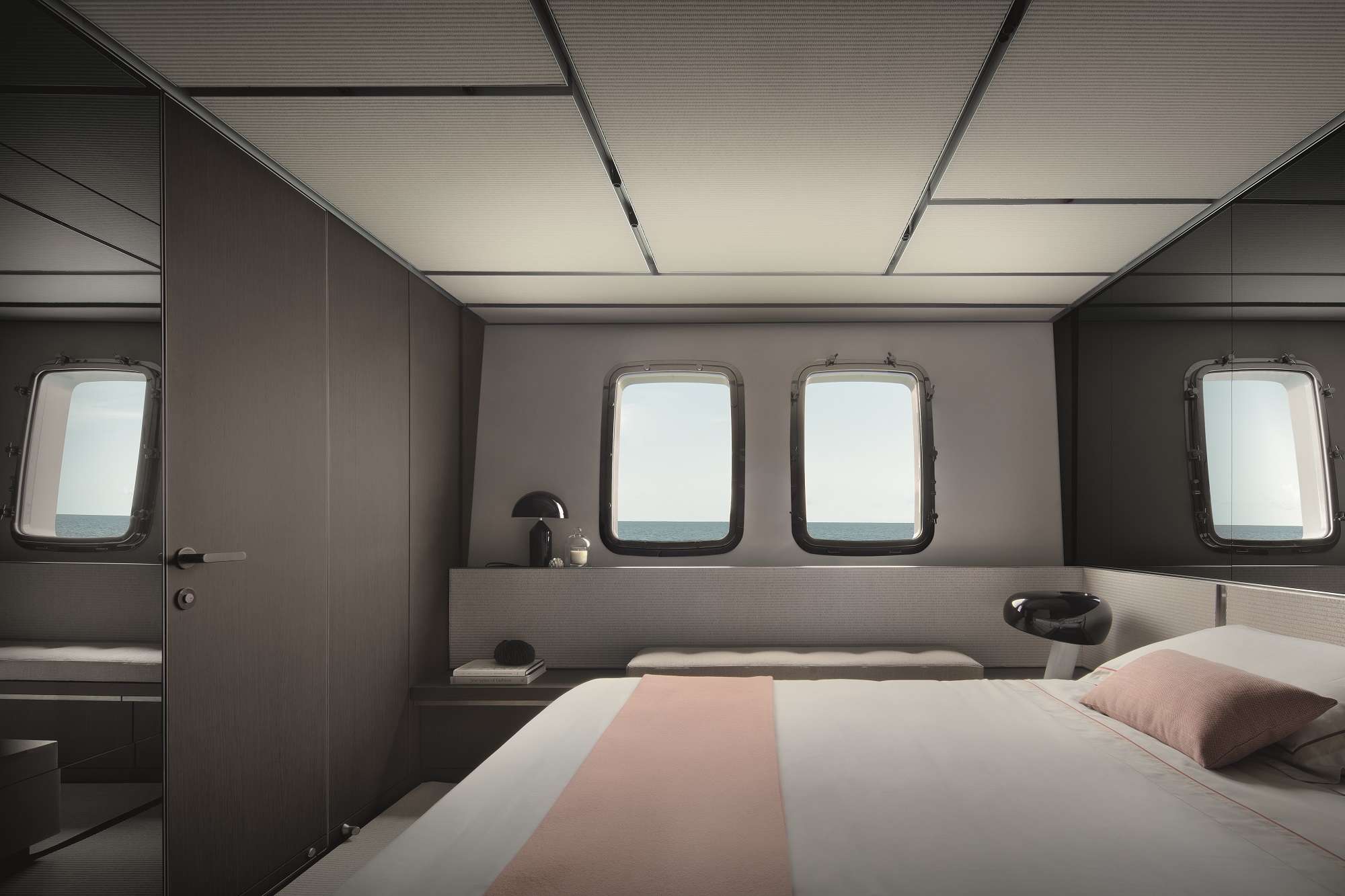 This innovative and spacious superyacht offers elegant accommodation for up to eight guests in four cabins, with further cabins providing overnight stay for the permanent crew of four.