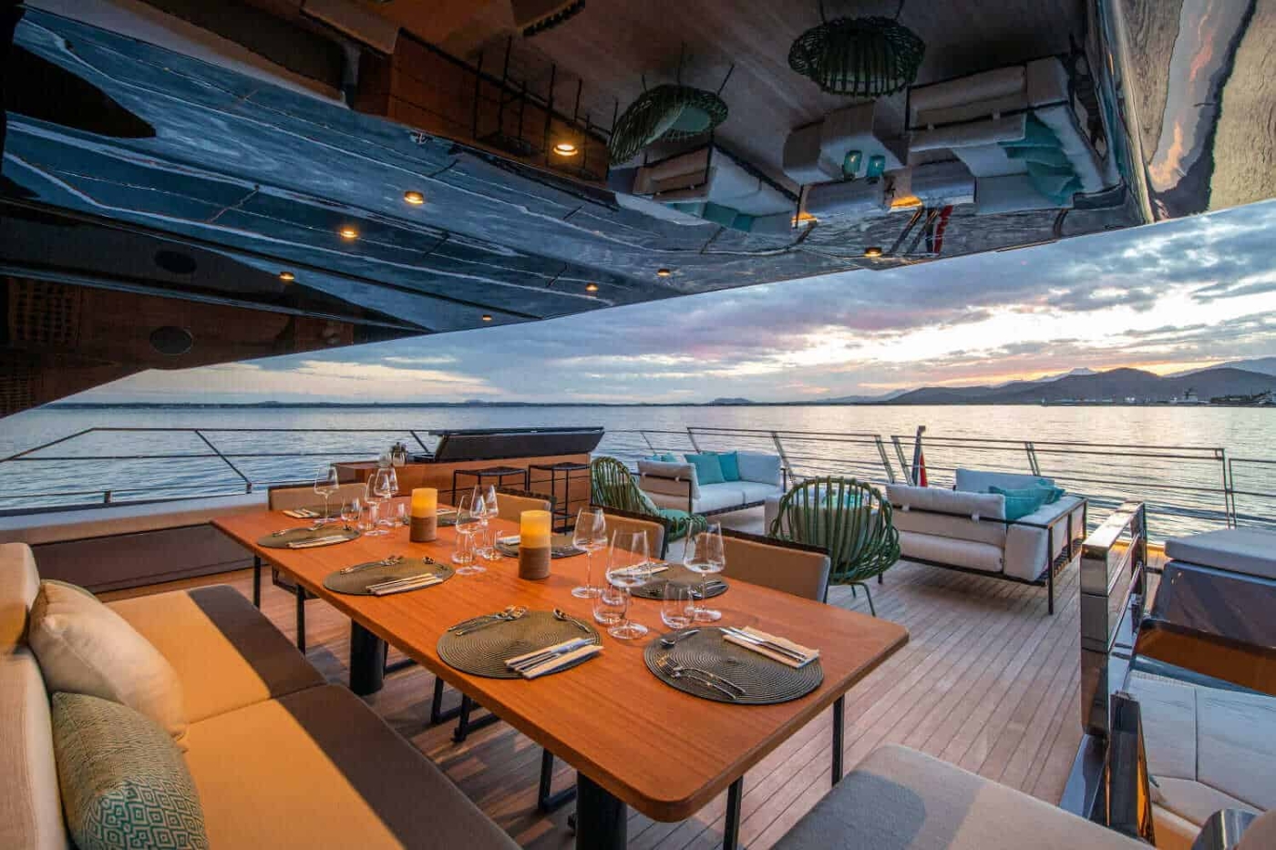The foredeck has a broad sunbed for unwinding in privacy in the sunshine, and the bridge deck aft has plenty of sun-drenched space for sunbeds, seating or alfresco dining.