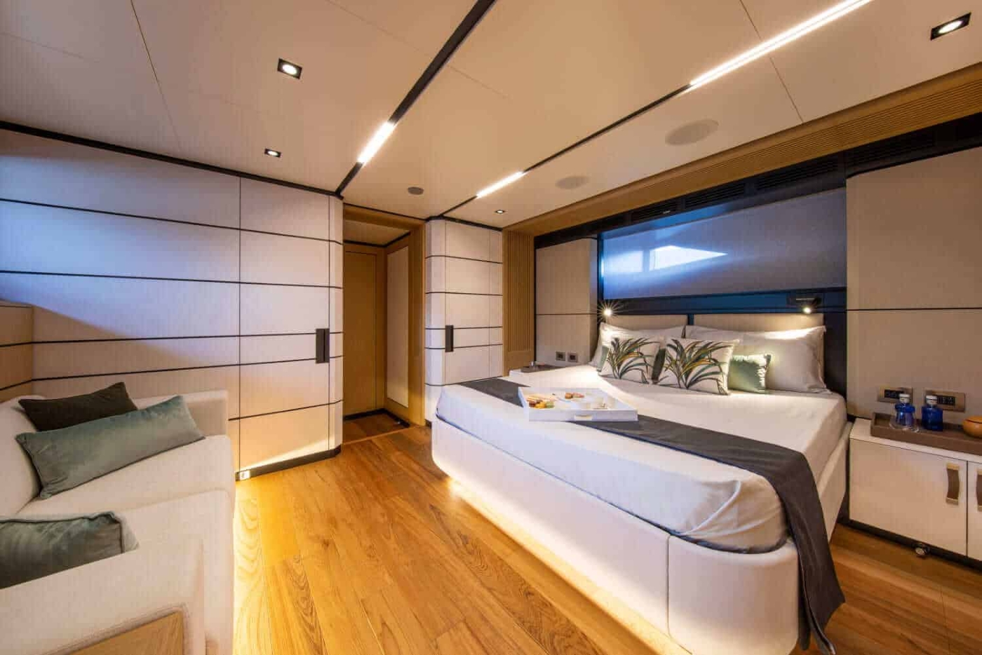 The lower deck layout contains a crew and galley, plus the guest accommodation, engine room and a beach club/tender garage in the stern with fold-down terraces on both sides to expand the outdoor space.