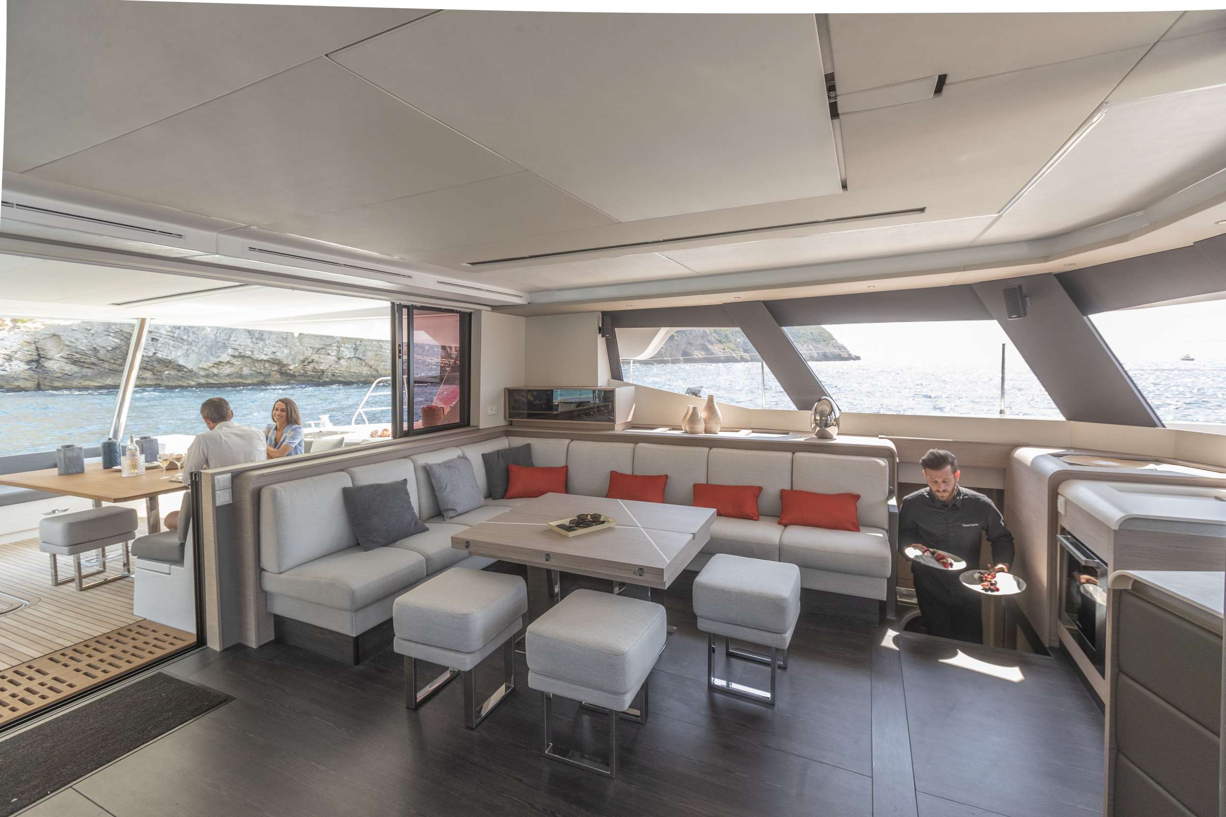 From the main aft deck, floor to ceiling glass doors as well as large glass panels windows leads into the main salon. Here there is a large dining table, with couch seating on two sides with additional stool seating.