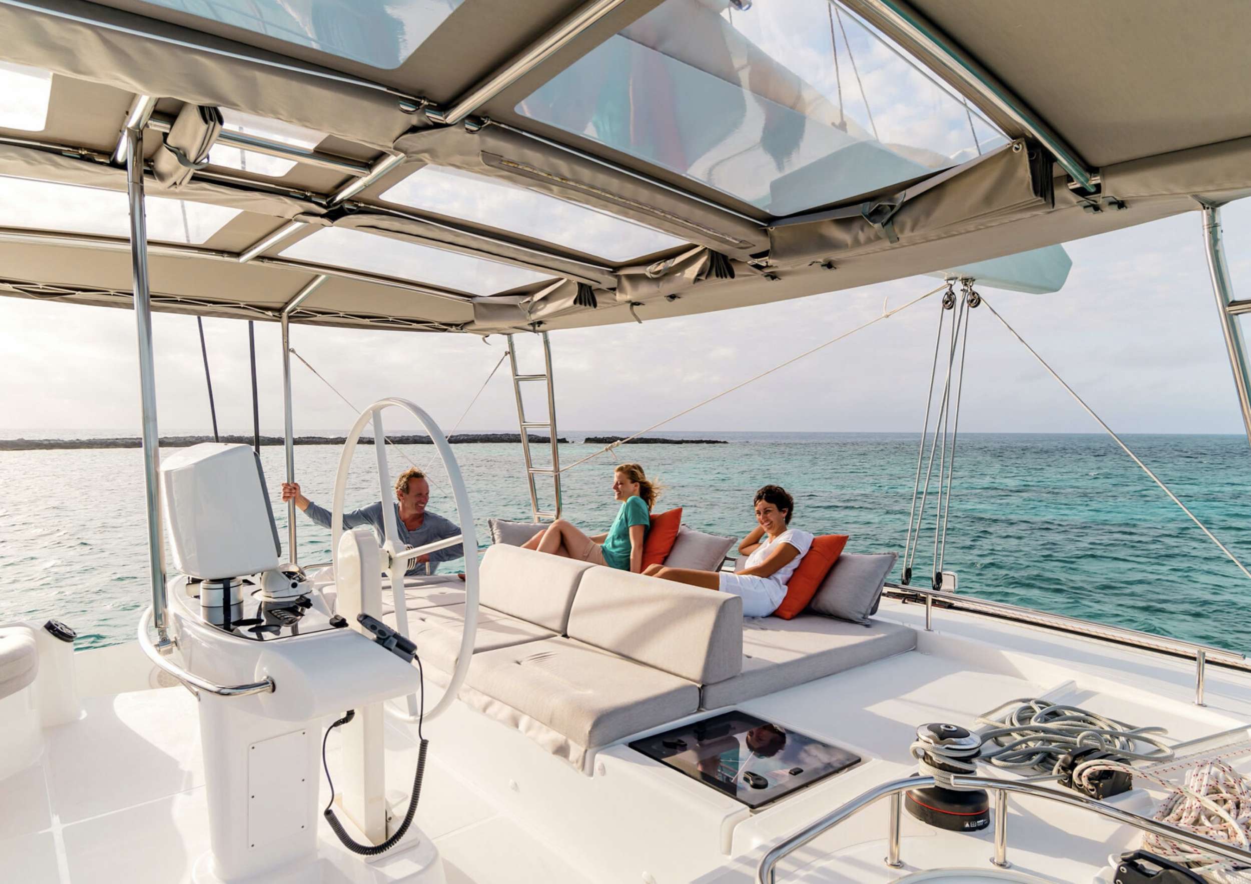 Above on the flybridge is another wonderful seating area, filled with an assortment of couches and sunpads, so that guests can laze about while enjoying the views from the deck’s elevated position.