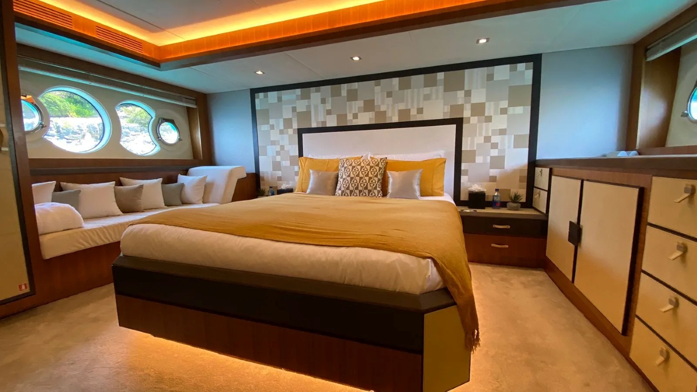 Glass sliding doors lead out onto the main deck aft, and can be opened for a greater connection to the location.
