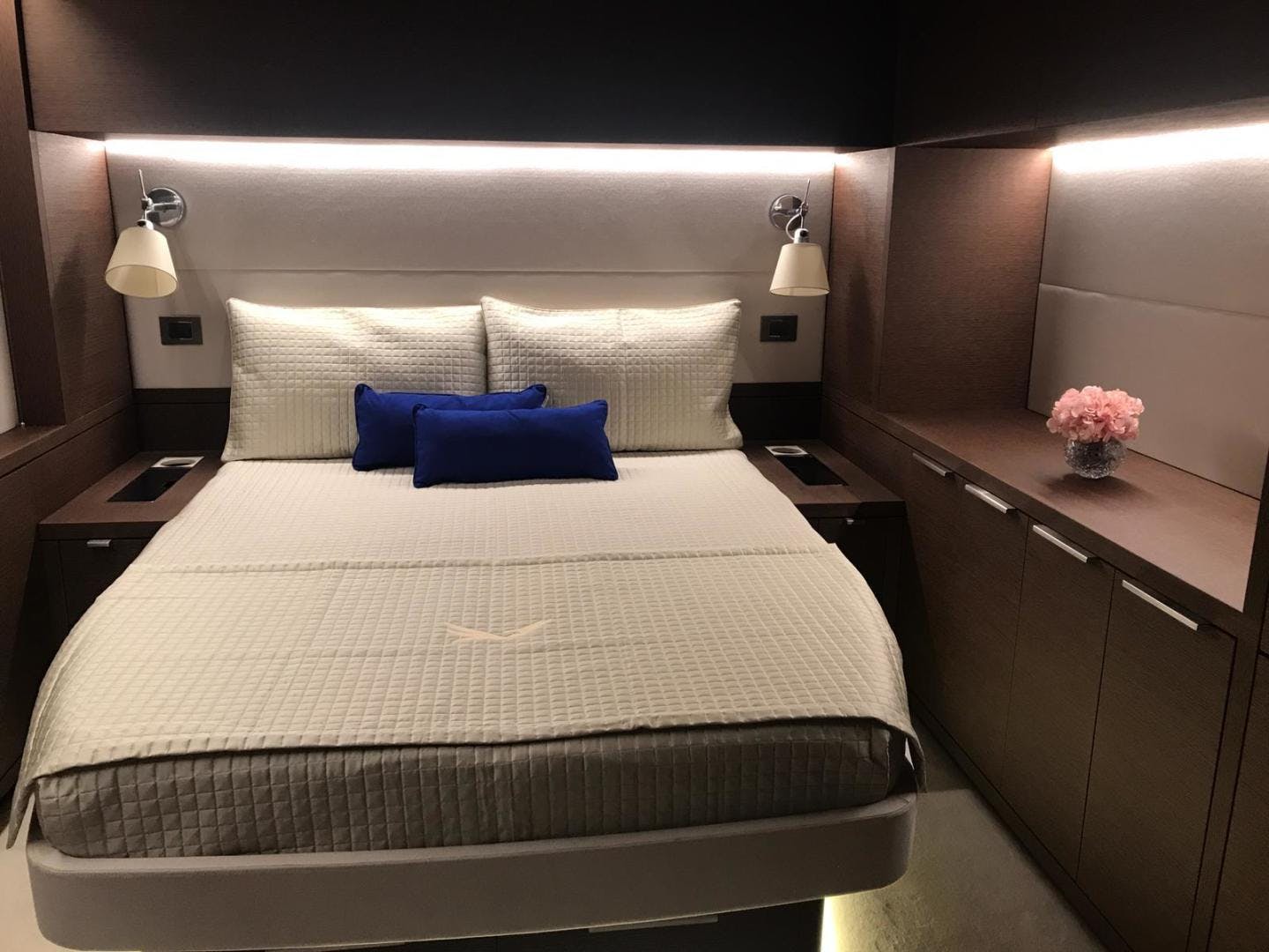 Another sofa is placed along the stern, and two stairways lead to the hydraulic aft swim platform for easy access in and out of the water.