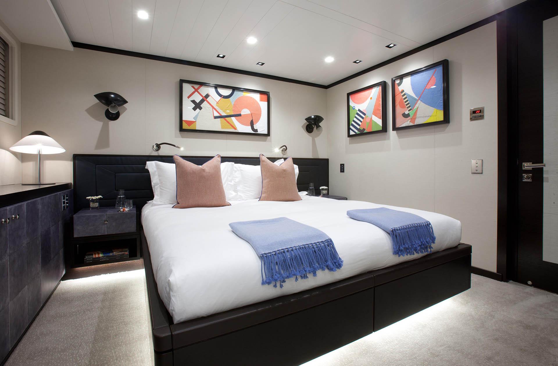 The Master Stateroom is on the main deck and full beam of the yacht, with a cool-toned crushed velvet effect carpet, king size walk around bed, light wood furnishings, desk, lounge, crisp white planked ceilings and boasting spa-like en-suite facility with shower and tub, space is both roomy and inviting.