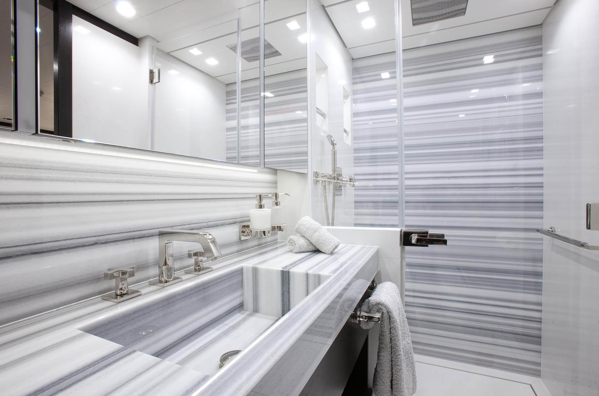The Master Stateroom is on the main deck and full beam of the yacht, with a cool-toned crushed velvet effect carpet, king size walk around bed, light wood furnishings, desk, lounge, crisp white planked ceilings and boasting spa-like en-suite facility with shower and tub, space is both roomy and inviting.