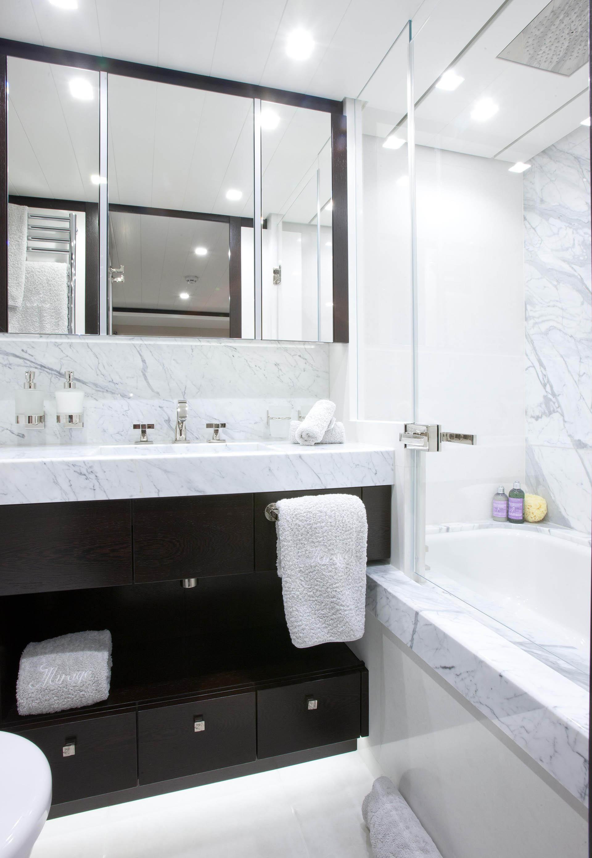 The Master Stateroom is on the main deck and full beam of the yacht, with a cool-toned crushed velvet effect carpet, king size walk around bed, light wood furnishings, desk, lounge, crisp white planked ceilings and boasting spa-like en-suite facility with shower and tub, space is both roomy and inviting.