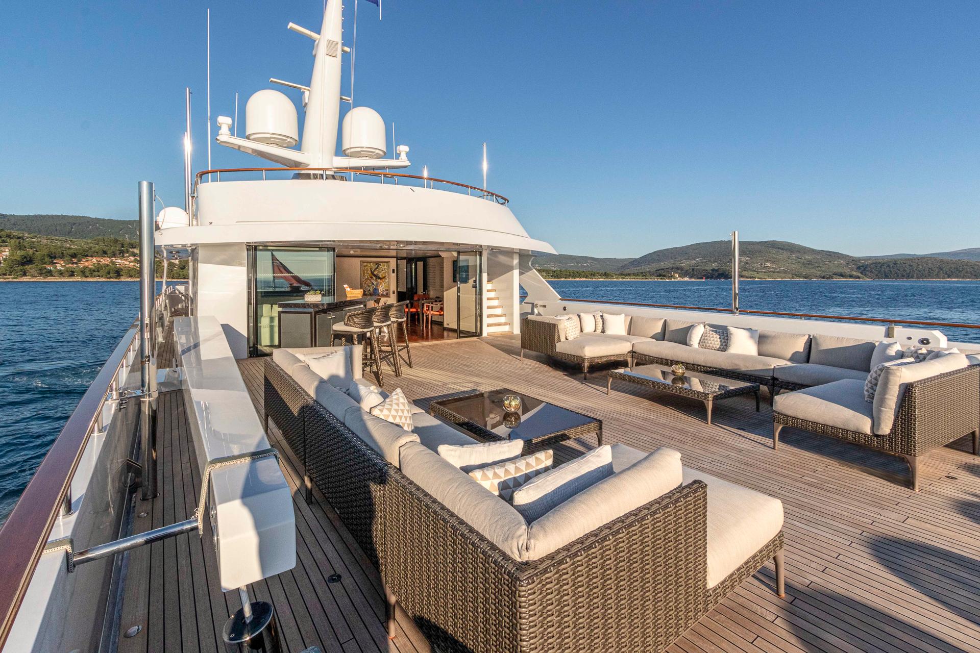 Yacht MIRAGE offers a generous deck plan; the aft deck features an alfresco dining option and cocktail seating, ideal for enjoying a sundowner at the custom-built high gloss wet bar. Above the main deck, the sundeck is roomy and open with an alfresco dining option, removable Bimini cover and extra comfortable lounge chairs.