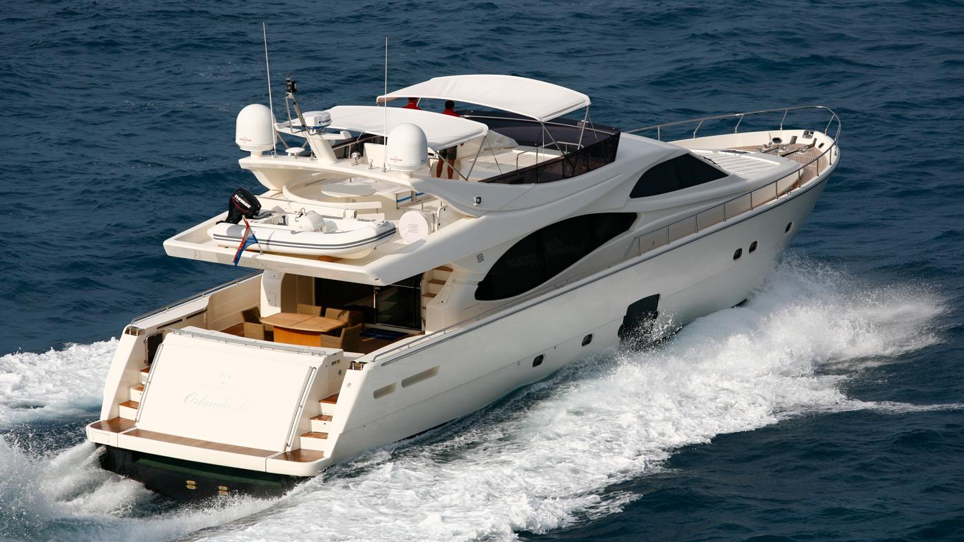 Motor yacht ORLANDO L is a 24.05m (78' 10") 2007 Ferretti 780 luxury motor yacht. With a beam of 5.95m (19' 6") ORLANDO L features the interior layout that maximizes living spaces space. With a draft of 1.86m (6' 1") she is capable of cruising in the shallow waters to access areas larger yacht would not normally cruise in.