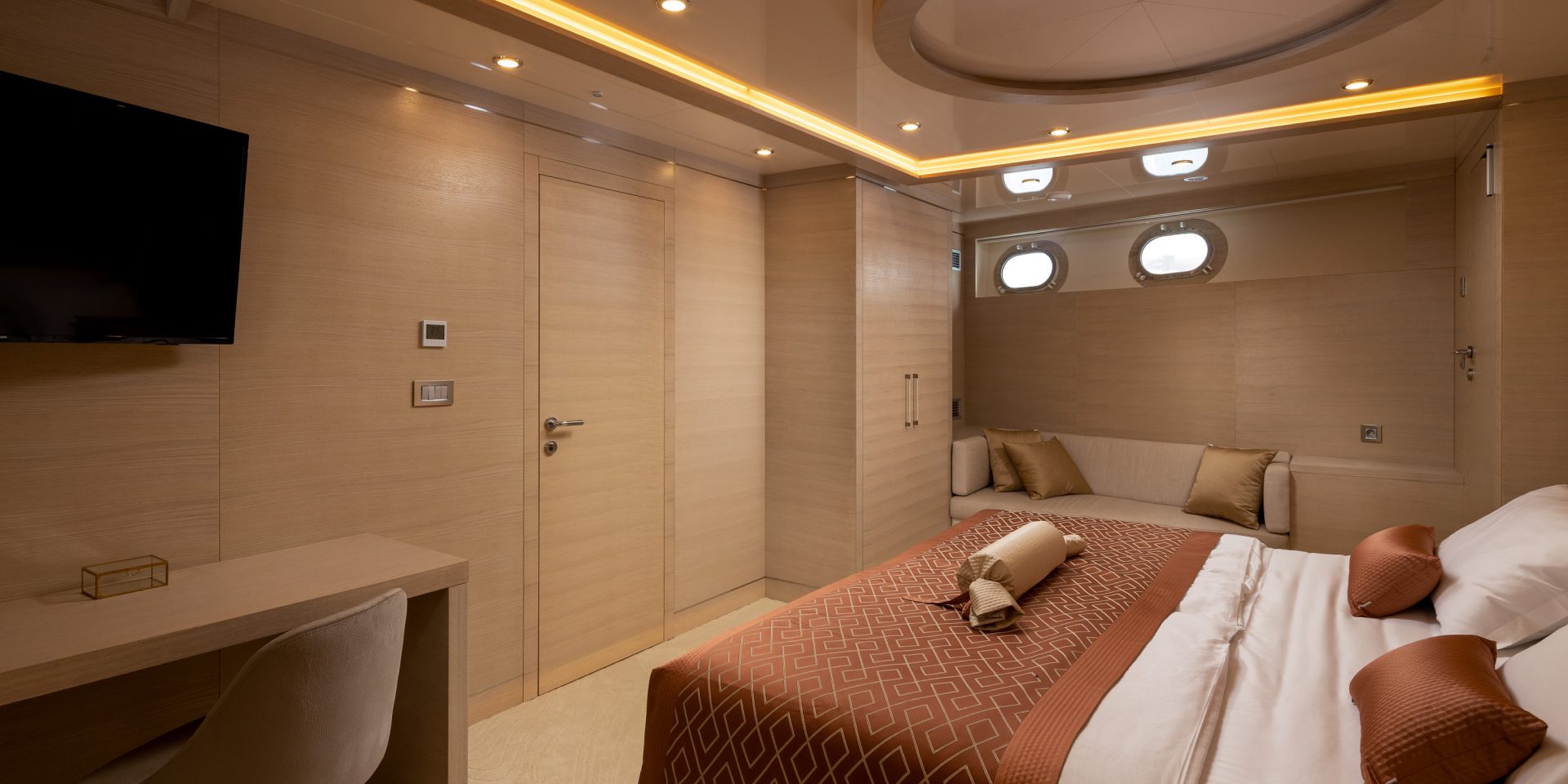 The aft to port corner is dedicated to a bar, where four comfortable seats make an intimate setting for drinks and conversation.