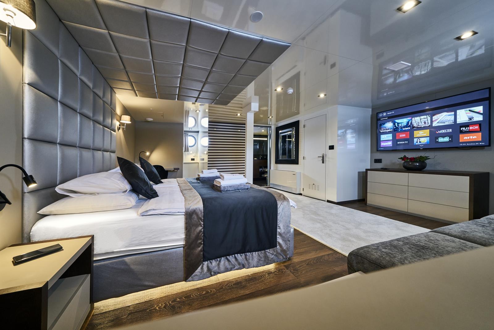 The stairway down to the guest accommodation is in the centre of the room, and the forward section hosts the galley to port and the helm station.