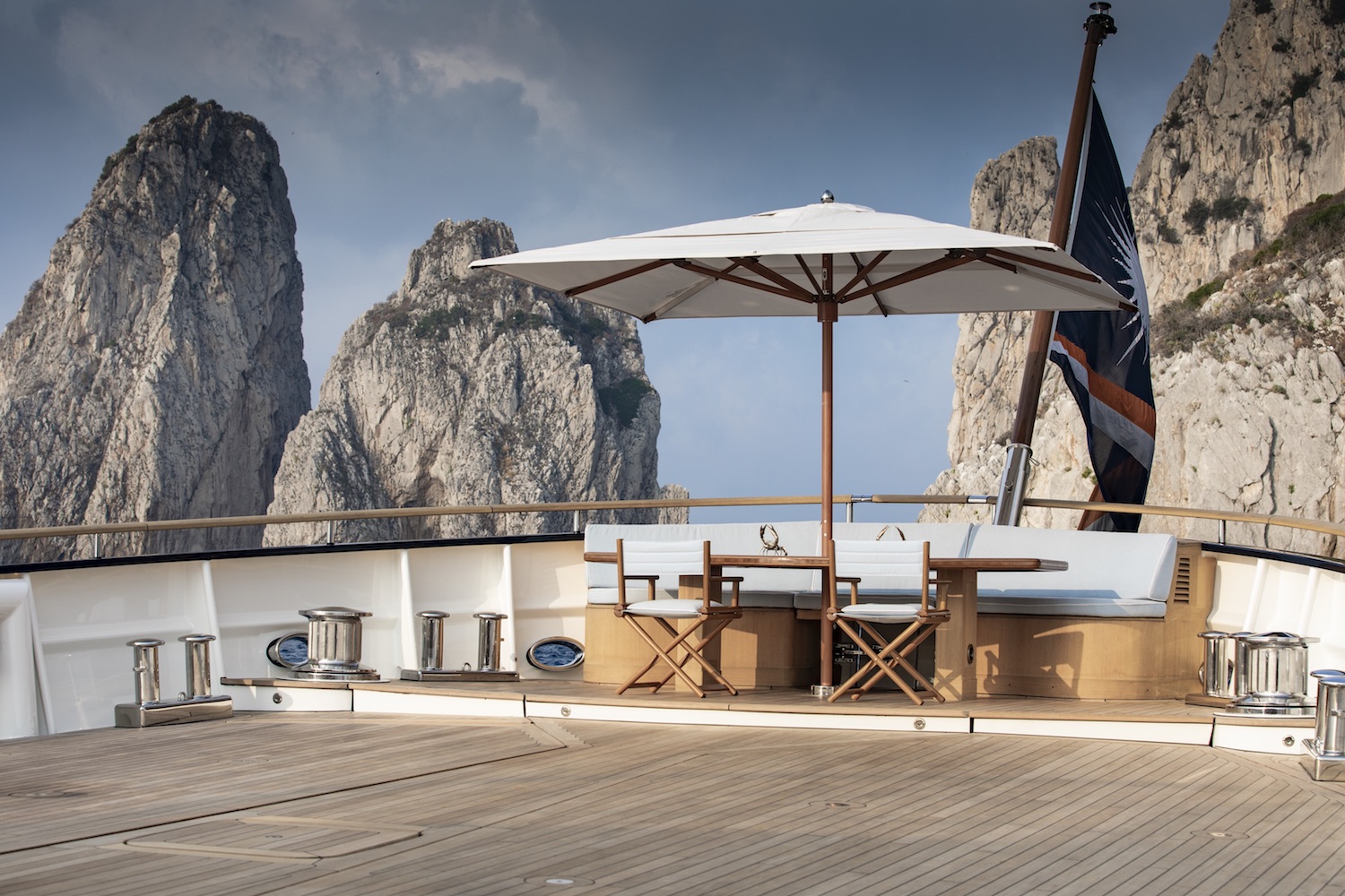 Another sofa, alfresco dining table and additional chairs is placed along the stern for alfresco dining in the open air. The foredeck is just as large, and comes with sofas beside the skylights and a C-shaped sofa for outdoor ...