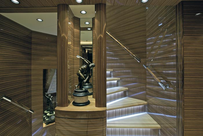 After the day head, there is a stair-case leading up to the VIP cabin, Salon and Bridge and Twin cabins with Pullman berth, en-suite facilities with one water basin and shower, Satellite TV, DVD, CD and Stereo System, Air-conditioning and heating.
