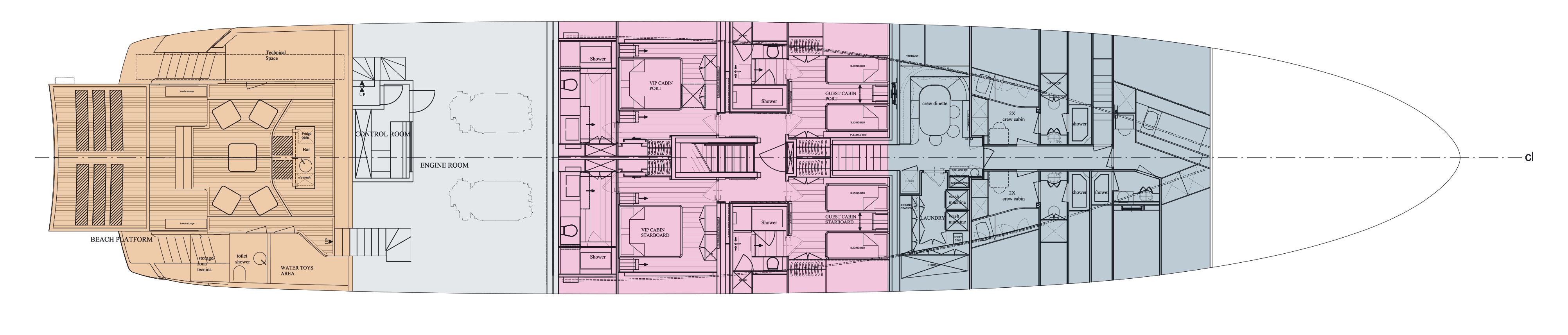 The sky lounge is a spacious alternative to the main salon for relaxing in the afternoons of evenings and has a cinema setup with a massive widescreen TV mounted on the forward wall with a pair of chaise loungers and a deep sofa ...
