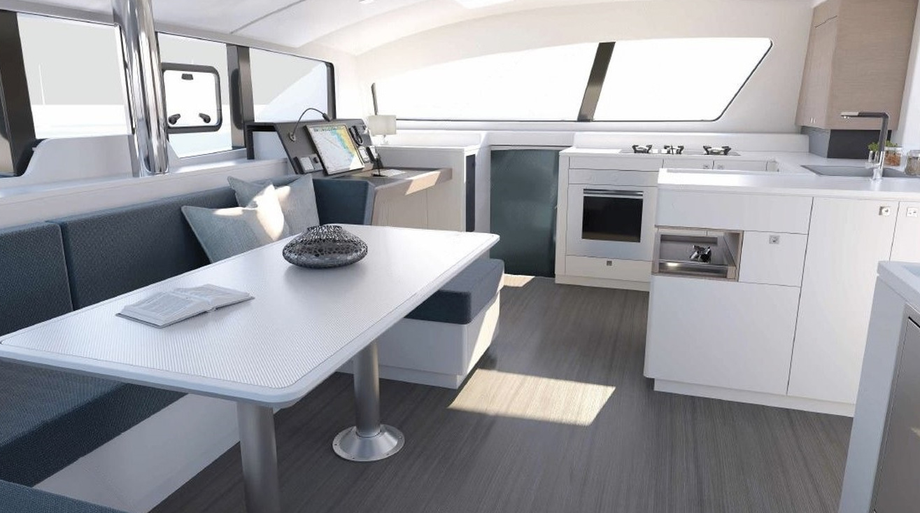 The central section places the navigation station and galley on the starboard side of the room, while the forward section has a C-shaped sofa and table for dining in the bright interior with the benefit of air conditioning.