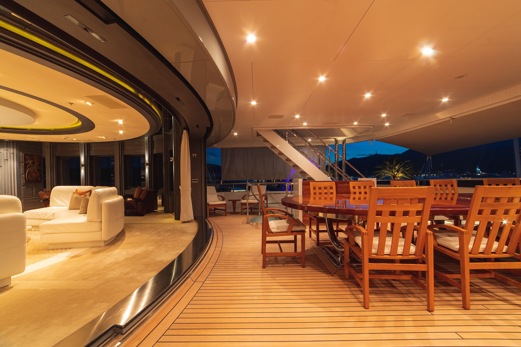 On the upper deck, the aft area is fitted with an alfresco dining area that ...
