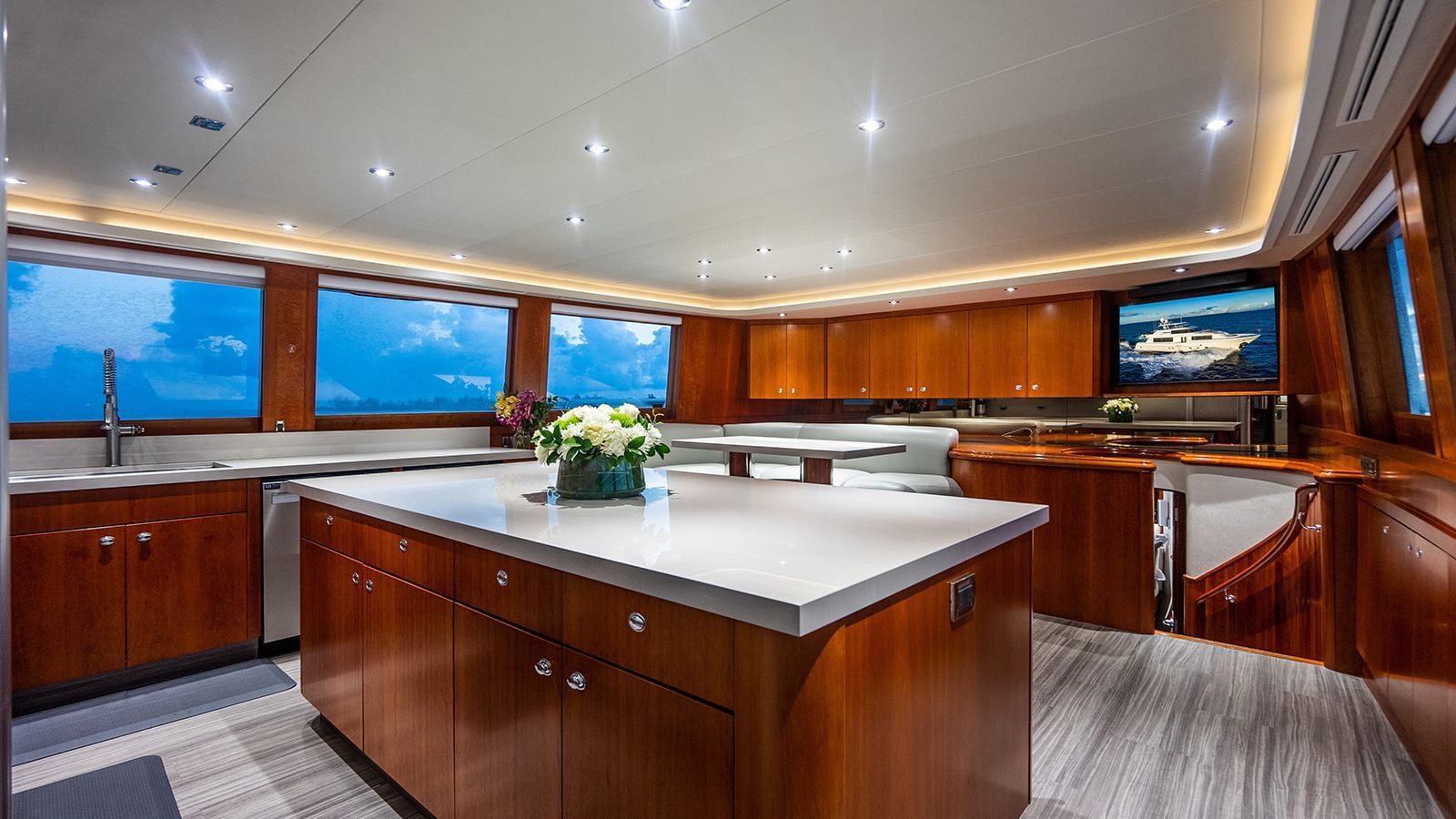 Forward of the main salon is the galley kitchen, which features all the expected amenities and appliances, including a wine rack fridge. There is also a lovely dinette seating area, which provides a wonderful place to enjoy a morning coffee while taking in the sights through the large windows.