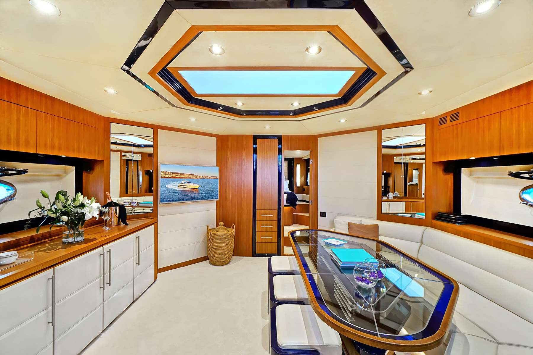 The main deck playout places the helm controls forward to port with the stairway to the guest accommodation centre and additional seating to starboard.