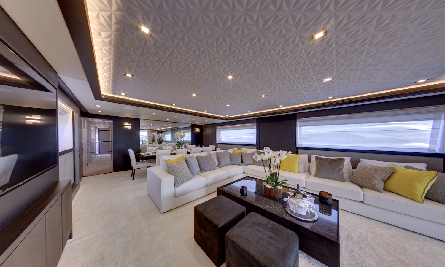 The formal dining area seats up to eight guests in silvery-white surroundings, where large windows along both sides of the room give excellent views and let in plenty of natural light. The salon behind consists of an aft-facing ...