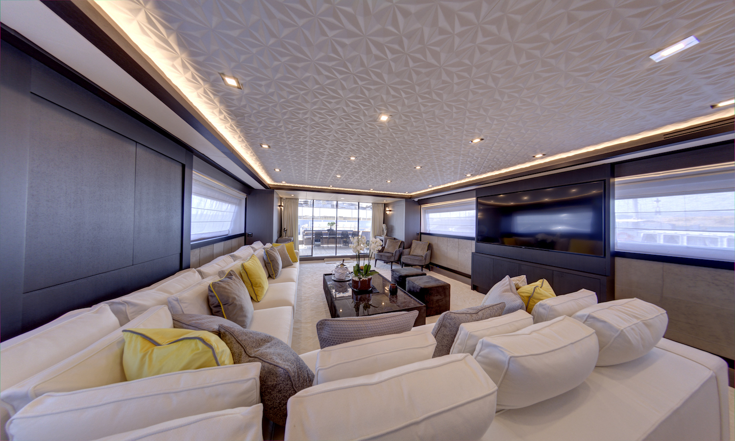 Amidships a Jacuzzi is to starboard and a bar opposite, and forward the Pilot and co-Pilot seats give guests an additional place to sit and enjoy the views.