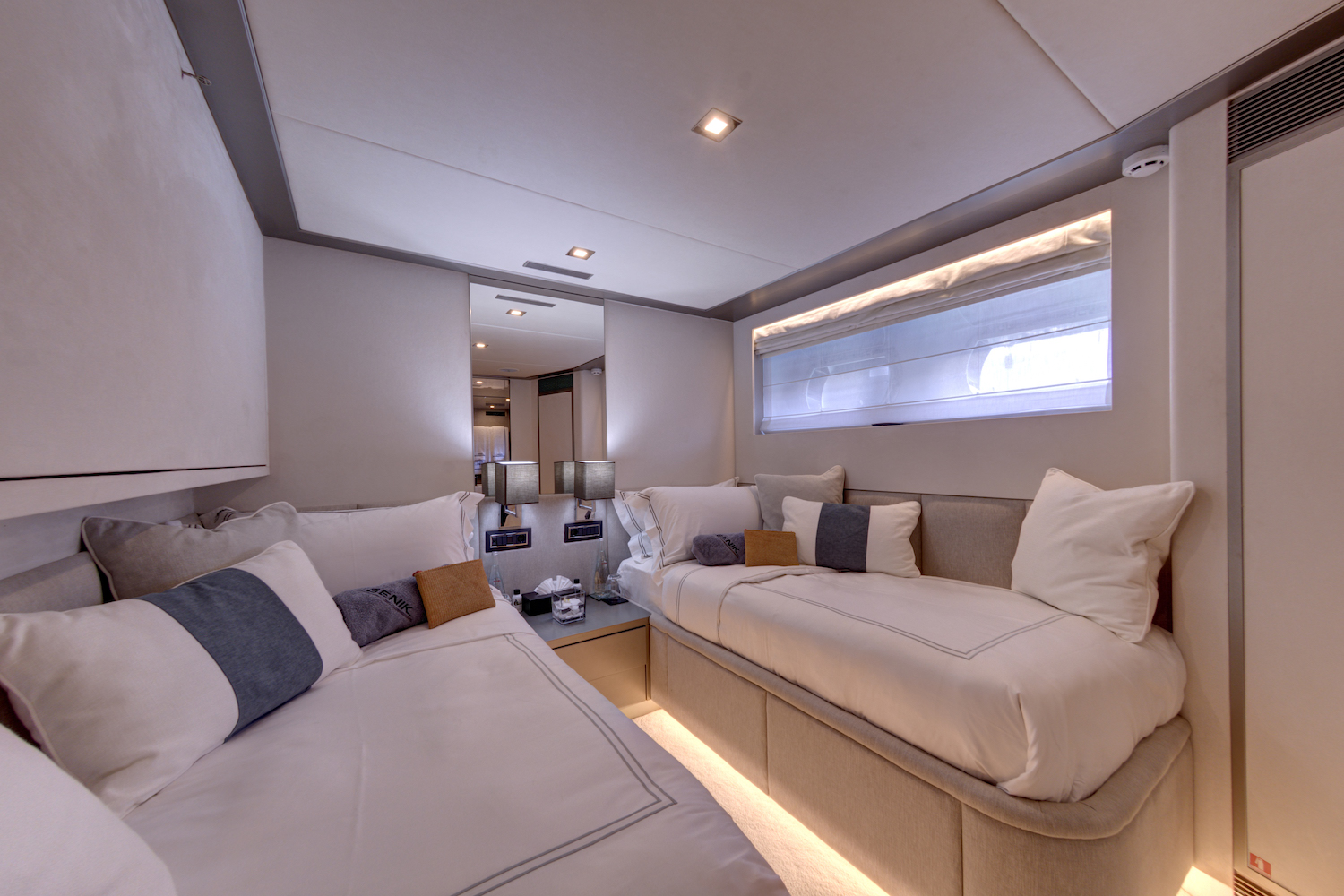 The yacht boasts interior design by Donald Starkey and can accommodate up to 12 charter guests over 5 en-suite deluxe cabins, with additional crew accommodation for 6.
