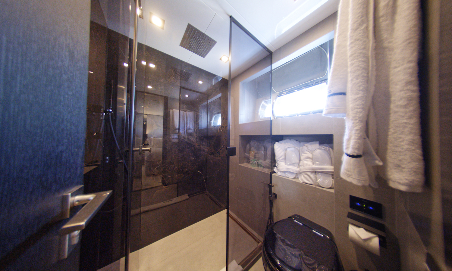 A pair of MTU engines producing 2,285 HP give a top speed of 24 knots, a fast ...
