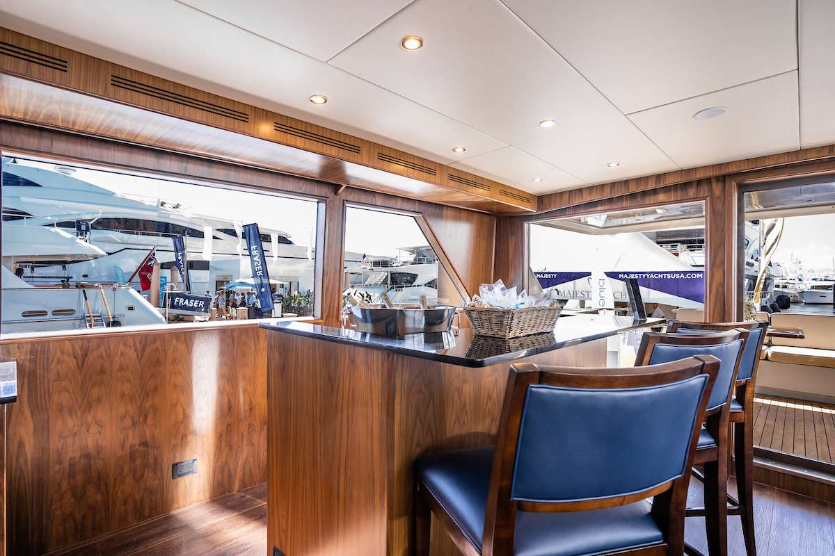 Up on the flybridge, there is the unique benefit of two Jacuzzis aft, forward of which are two sun loungers on both sides for drying off in the sunshine.