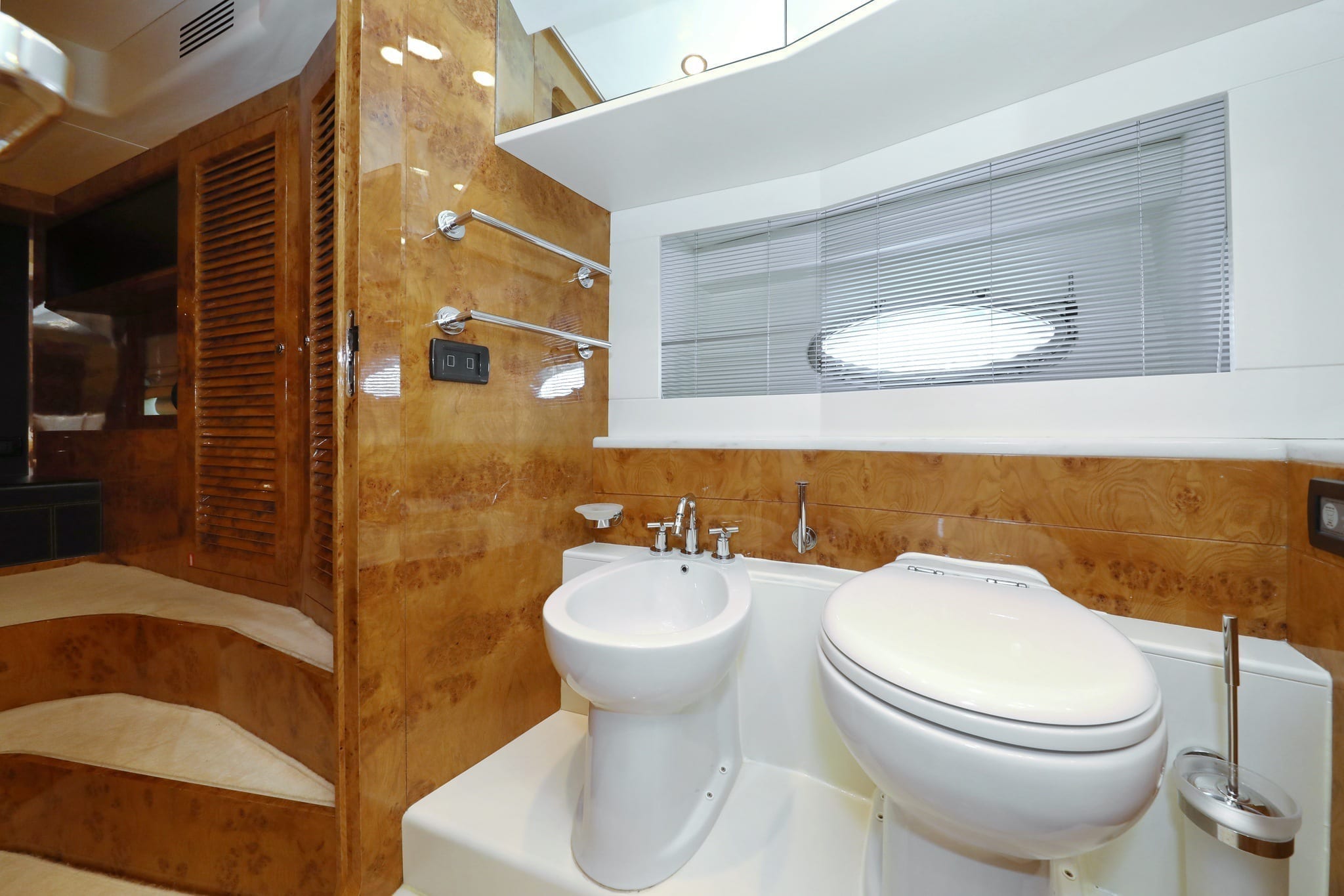 Behind, the spacious main salon is furnished with a sofa along the starboard wall accompanied by an armchair at both ends and a coffee table between them.