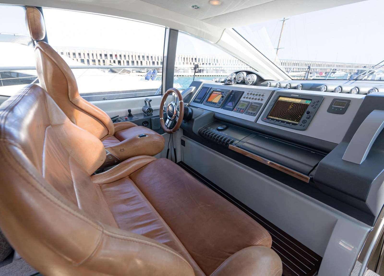 On the main deck, the helm controls are forward to port with the stairway down to the guest accommodation to starboard. An L-shaped sofa, armchair and coffee table take ...