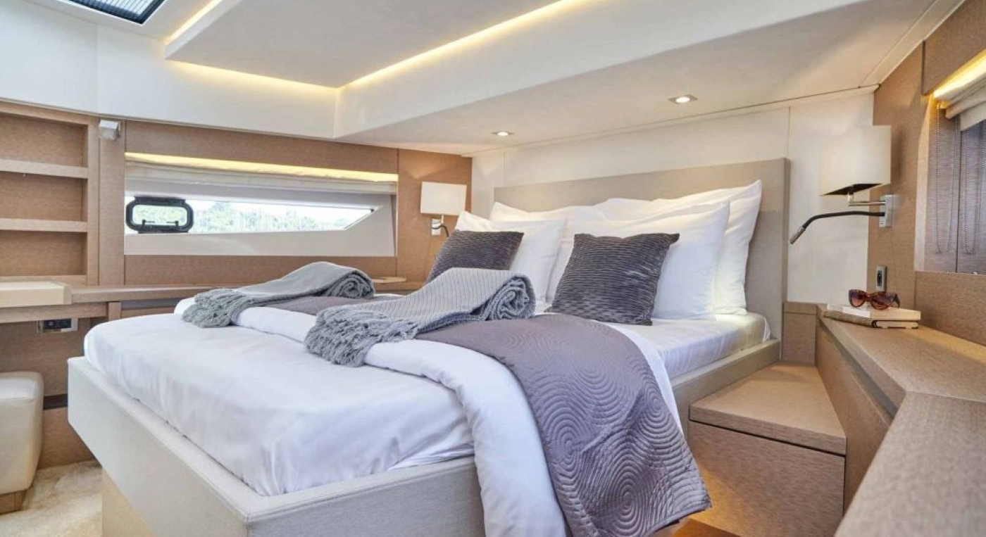 The Master suite is behind and has its own separate stairway to the main deck salon, and the engine room is behind followed by the crew accommodation in the stern.