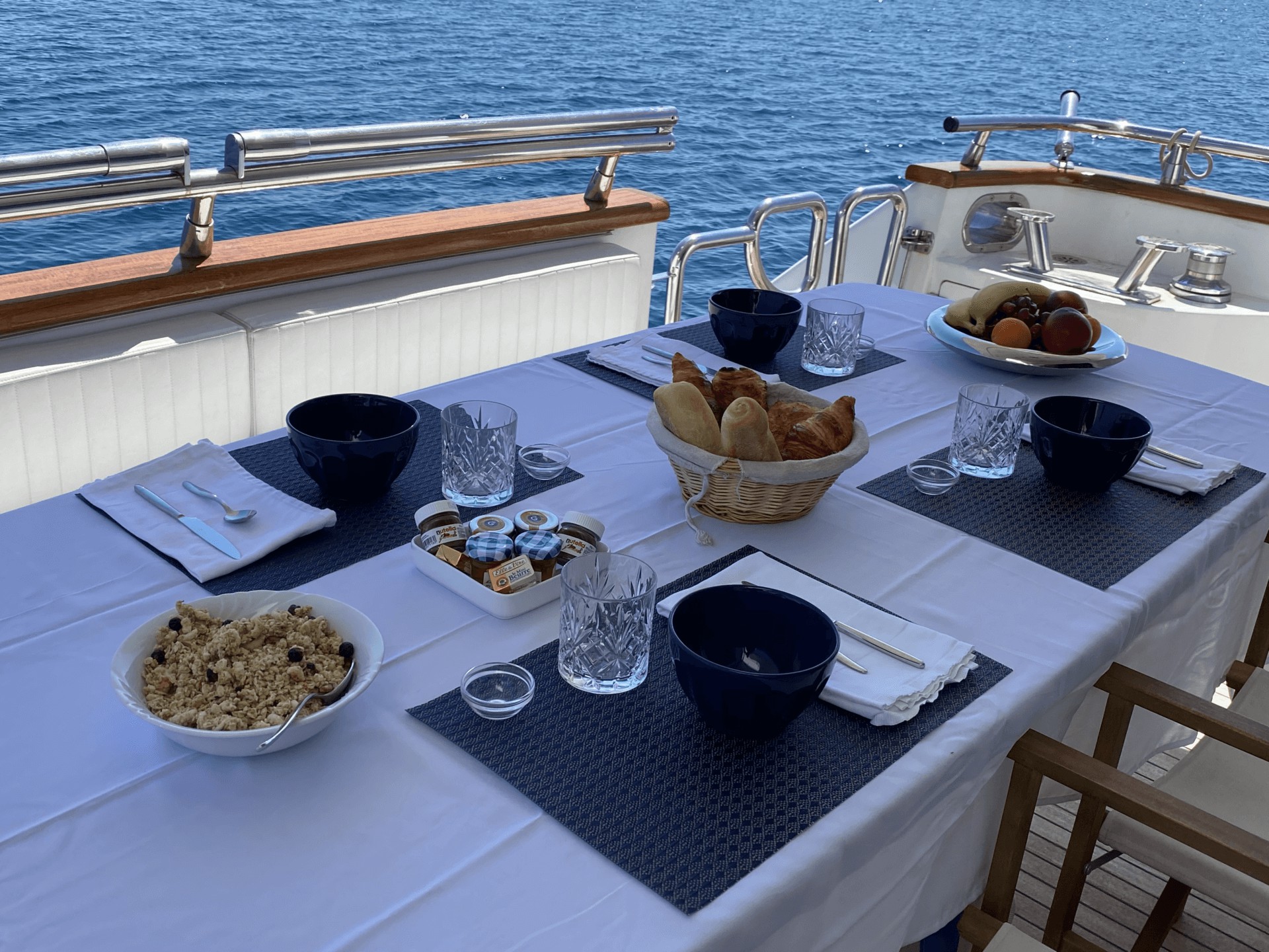 Two stairways lead down to the lower deck swim platform for access to the tender and water toys, and side walkways take guests around to the foredeck sunbed.