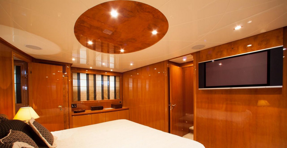 The port side of the room has a second sofa and a widescreen TV for entertainment during transit and when winding down at the end of a busy day.