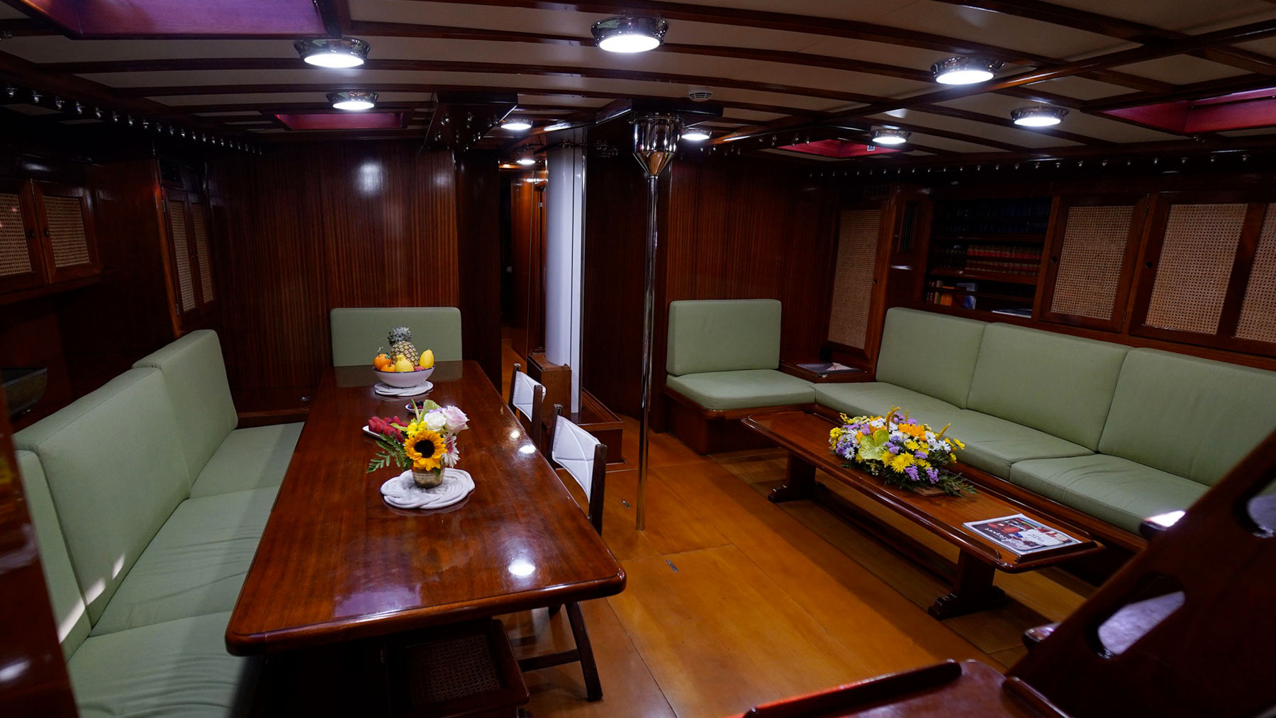 To port is the formal dining area with sofa seating against the wall and movable chairs down the centre, and to starboard two sofas are arranged into an aft-facing L-shaped layout along with a coffee table.