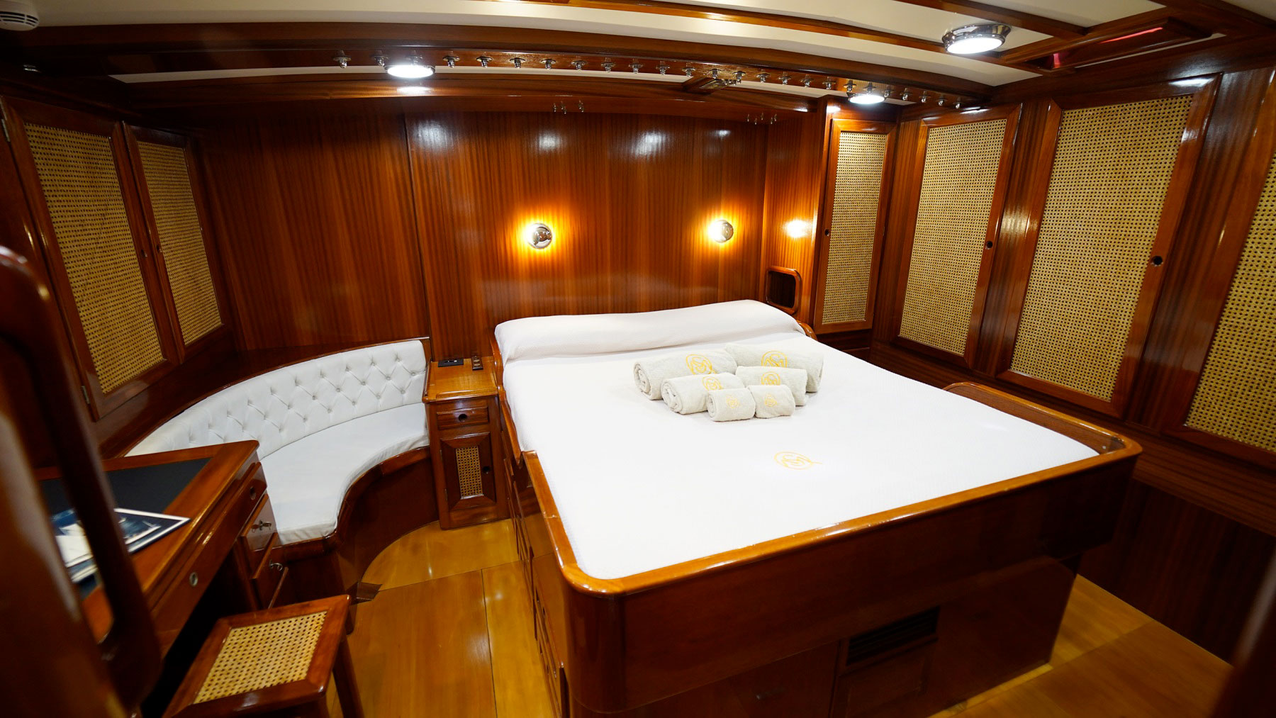 Accommodation on board is available for up to 10 guests in 5 cabins, with additional cabins for a crew of 3.