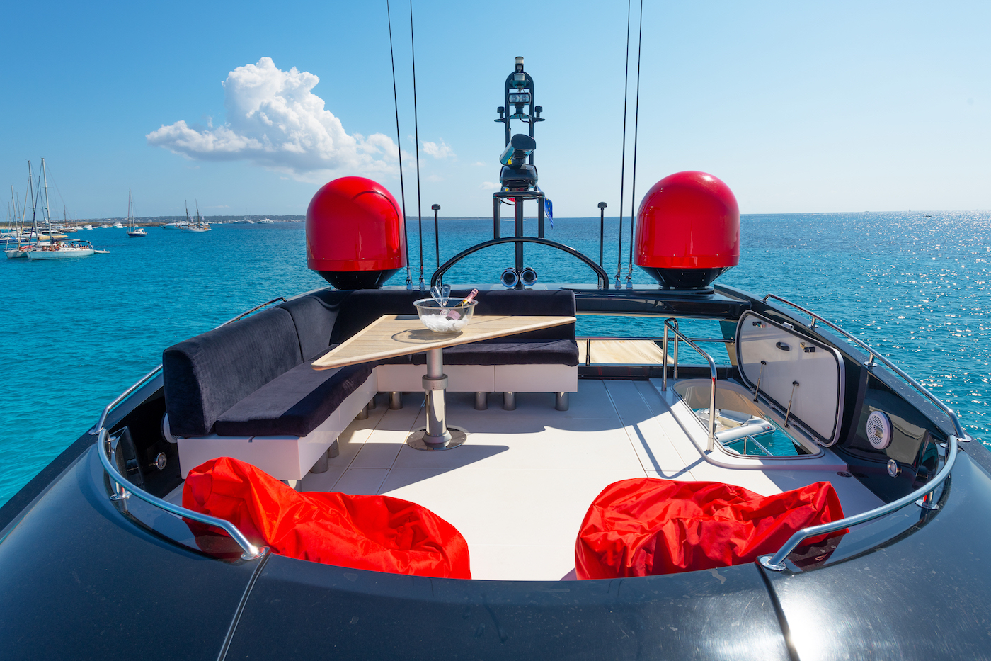 The open yacht layout boasts additional deck space on the flybridge which has a corner dining setting, deck beanbags for guests to relax and far-reaching views. The foredeck is an elongated space with a double inset sun pad and u-shaped sofa.