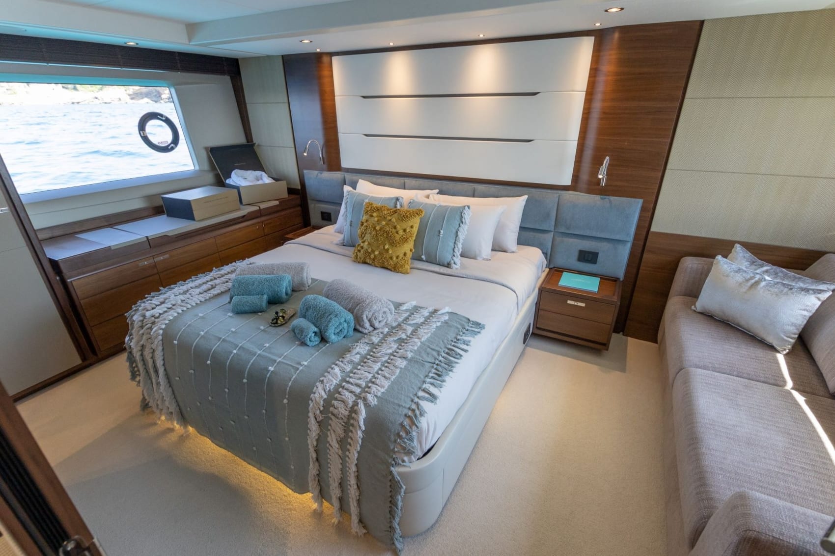 Her interiors can sleep up to 8 charter guests in 4 ensuite cabins. She also has a professional crew of 2. 1 full beam master stateroom with private owner's stair case and ensuite