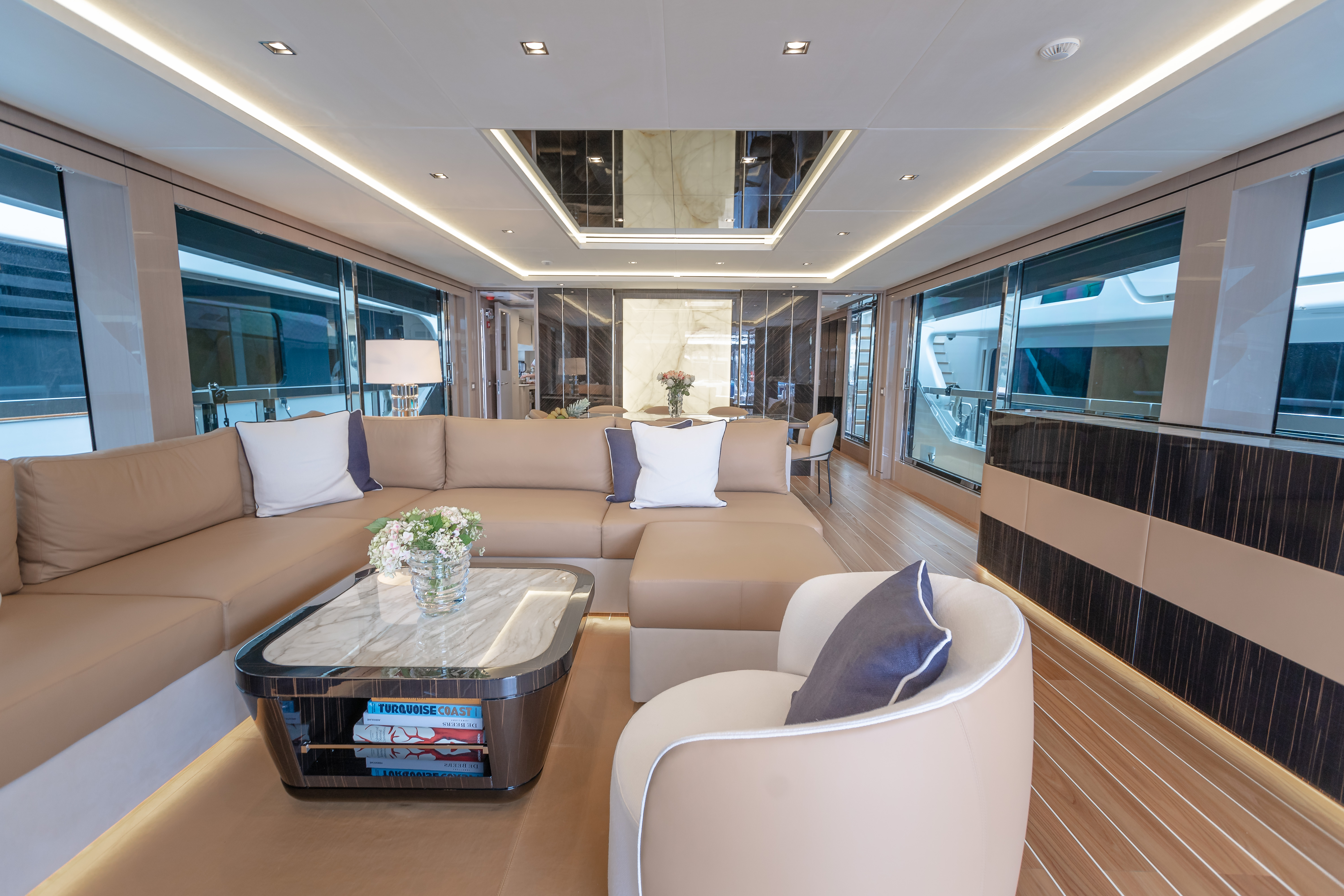 The flybridge is lined with a sunbed along the full length of the stern and is accompanied by a couple of drinks tables.
