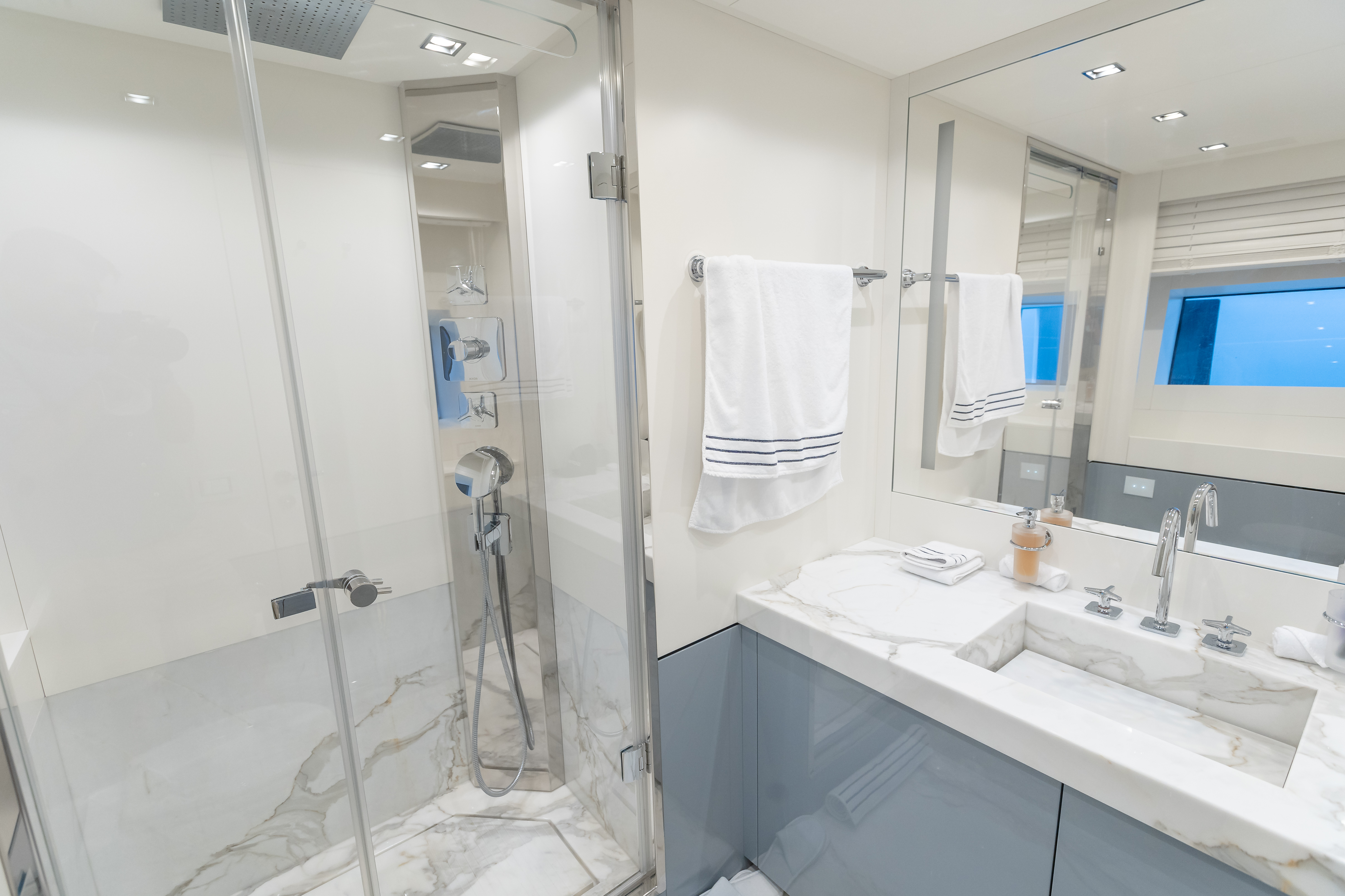 The formal dining area and main salon are combined into a single room aft, providing elegant contemporary dining for eight guests around the large table, with a back-lit wall for added ambiance and almost full-height windows for excellent views and natural light.