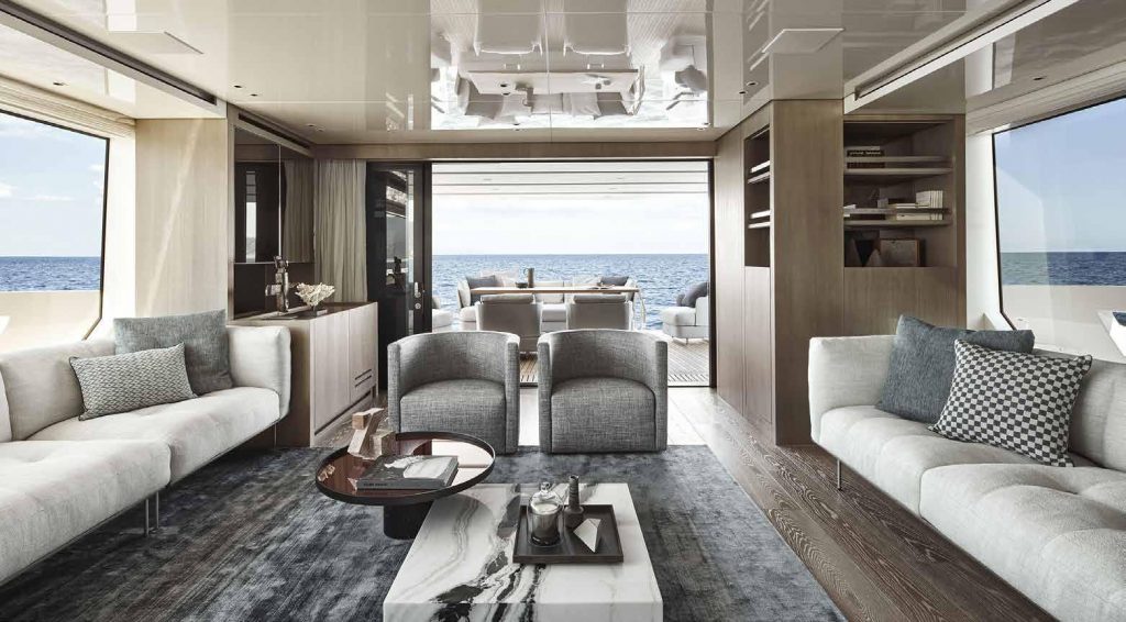 The semi-enclosed interior is forward and is fitted with a helm station to starboard, a bar to port and an L-shaped sofa along with a raised table and movable chairs for dining in comfort. The sun-exposed stern is lined with sun ...