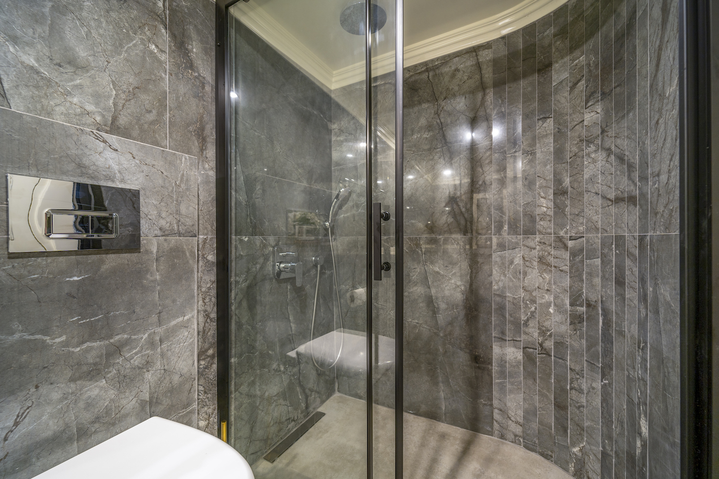 A widescreen TV is behind to port, followed by the stairs down to the aft guest accommodation, and another set of steps centrally that lead through glass sliding doors and connect to the main deck aft.