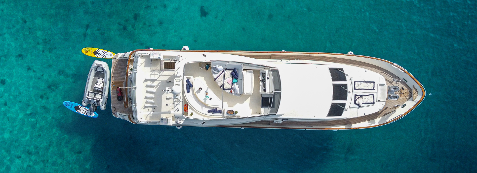 A port stairway leads to the sun-exposed flybridge above, and two stairways lead down to the lower deck swim platform, which is deep enough for sunbathing and lounging beside the water.