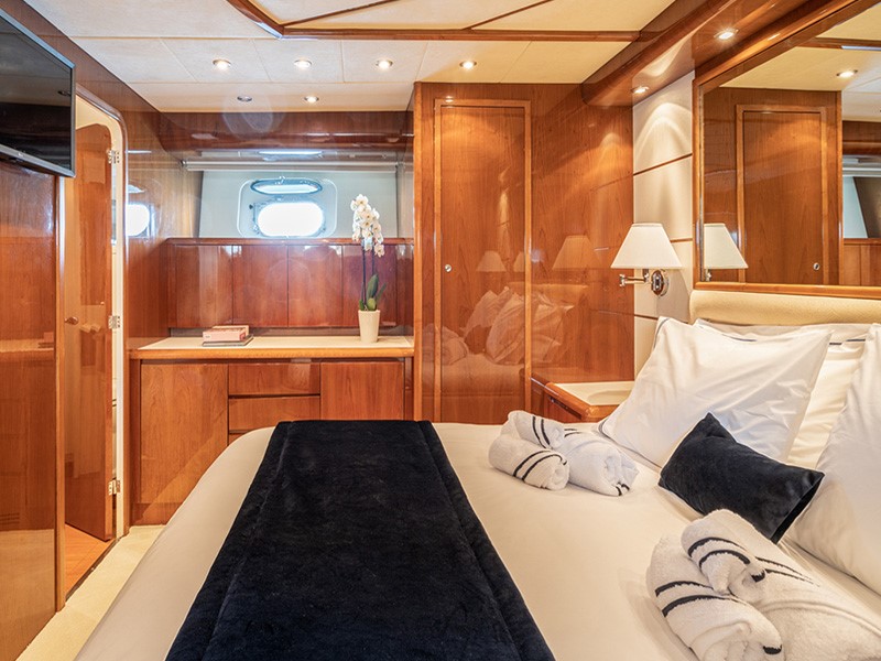 The yacht accommodates up to 10 guests in 4 cabins with additional accommodation for a crew of 5.