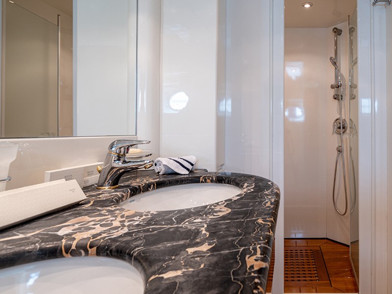 The port salon consists of a corner sofa and loveseat around a coffee table, and there is a widescreen TV to keep everyone entertained on quiet evenings and during long journeys.