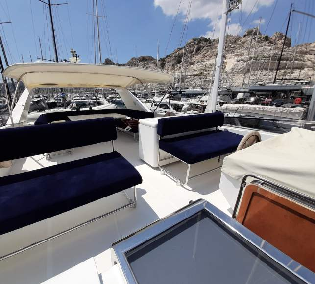 The flybridge provides a forward-facing C-shaped sofa and table amidships for casual dining beneath the shade of the canvas bimini.