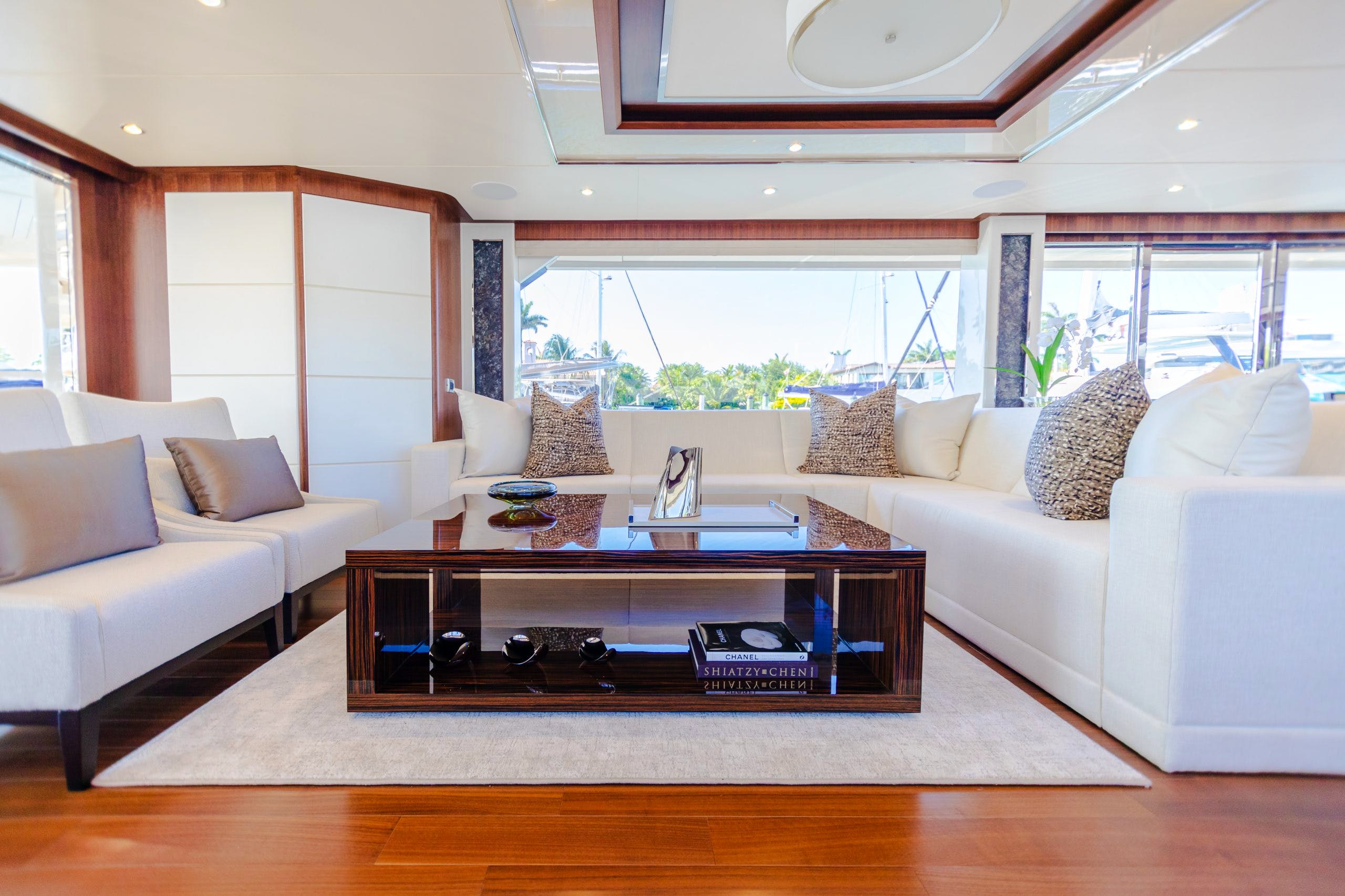 The helm station on the upper deck forward has a sofa to port where guests can sit and enjoy the views, and the skylounge aft.